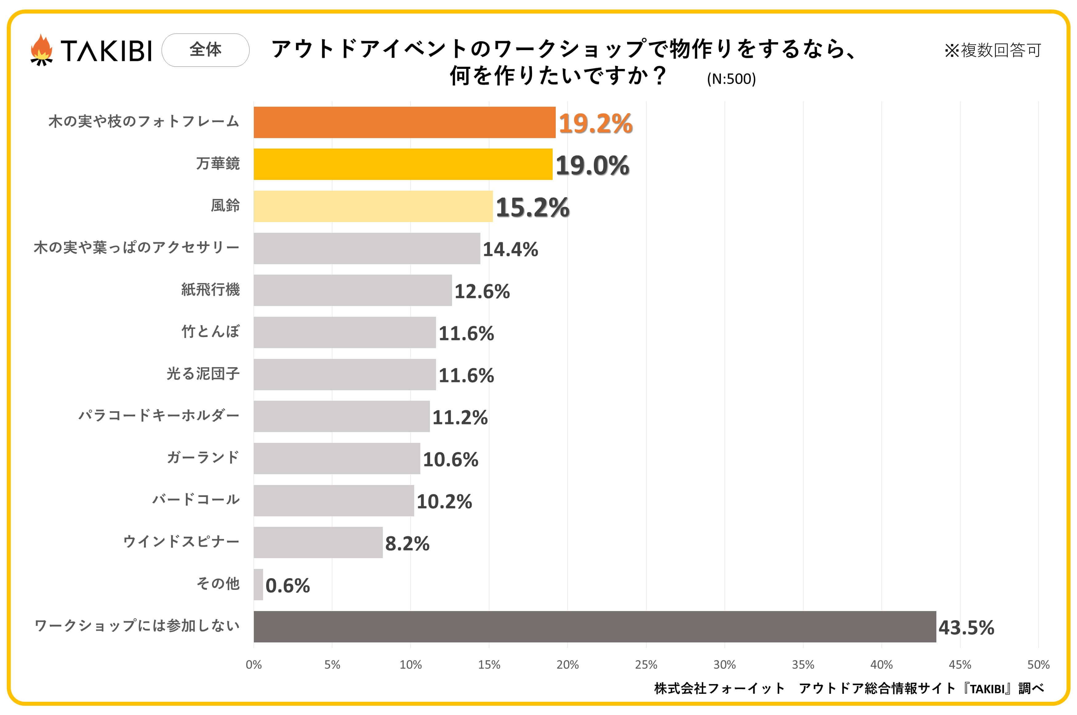 全国の10代~50代の男女を対象に、「アウトドアイベントのワークショップで物作りをするなら、何を作りたいですか?」というアンケートを実施したところ、最も多かった回答は「木の実や枝のフォトフレーム」で19.2%でした。次いで、「万華鏡」が19.0%、「風鈴」が15.2%で続くという結果になりました。また、「ワークショップには参加しない」と回答した人は43.5%で、約60%の人がワークショップへの参加に前向きなことが分かりました。