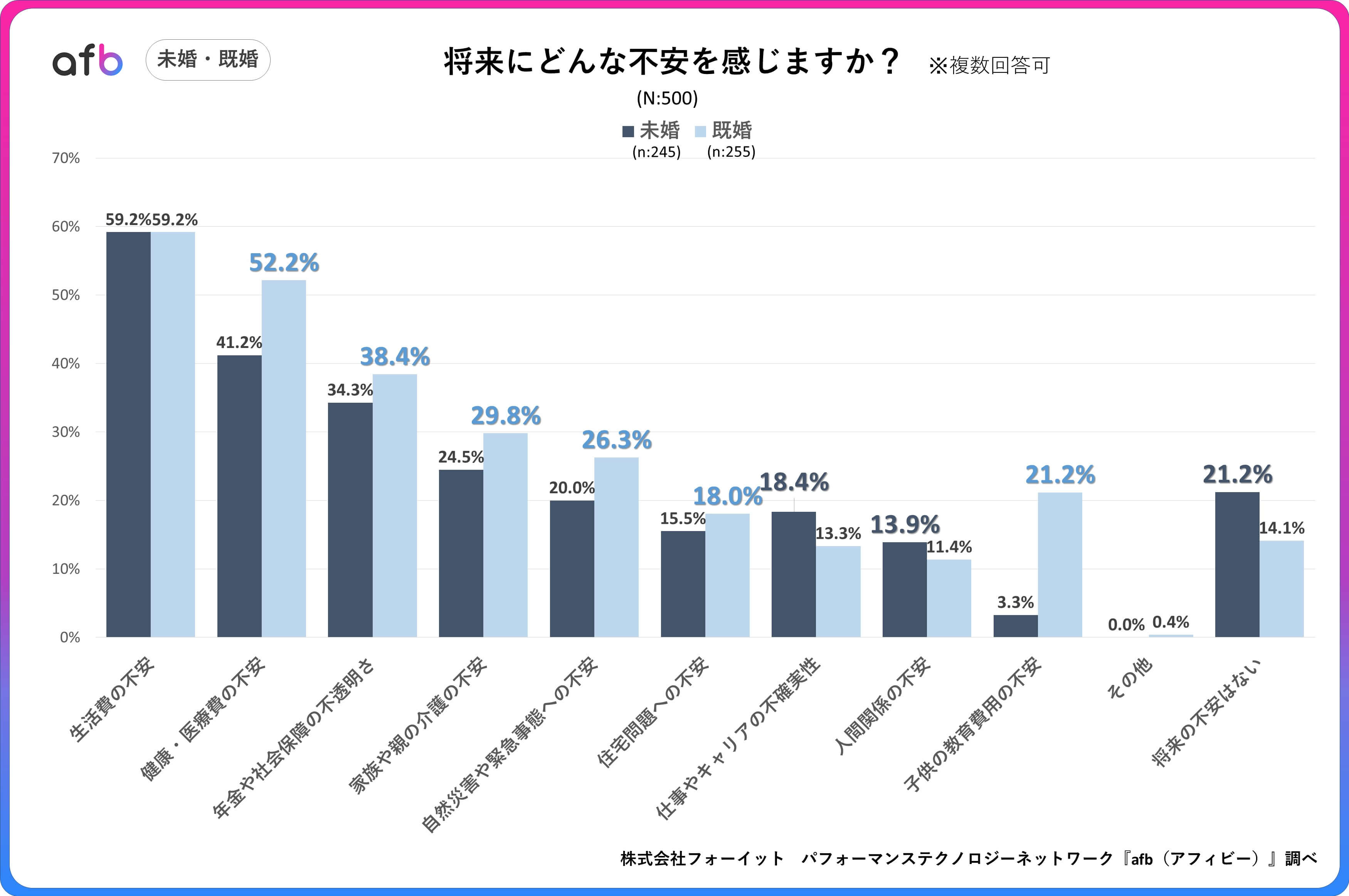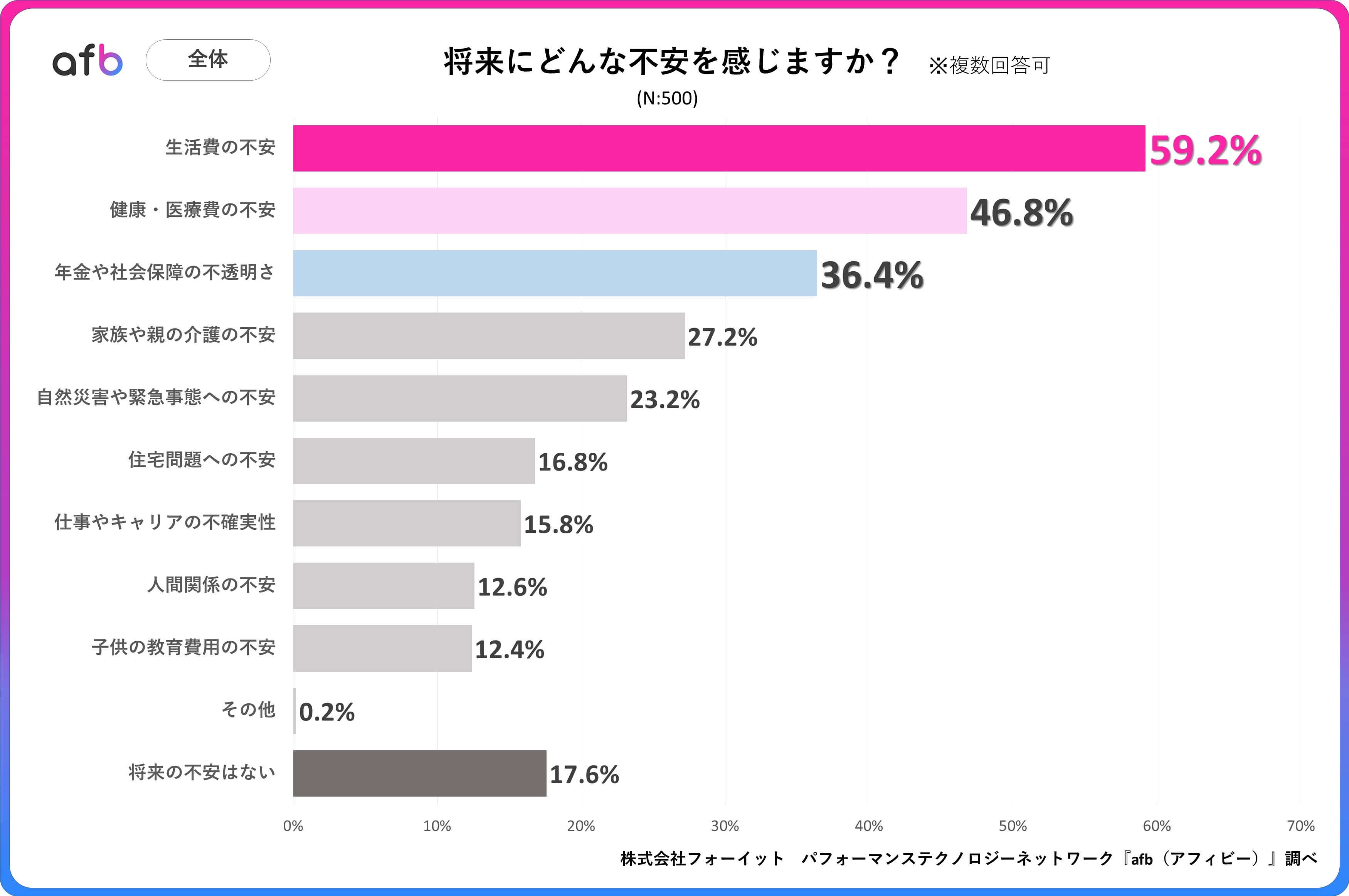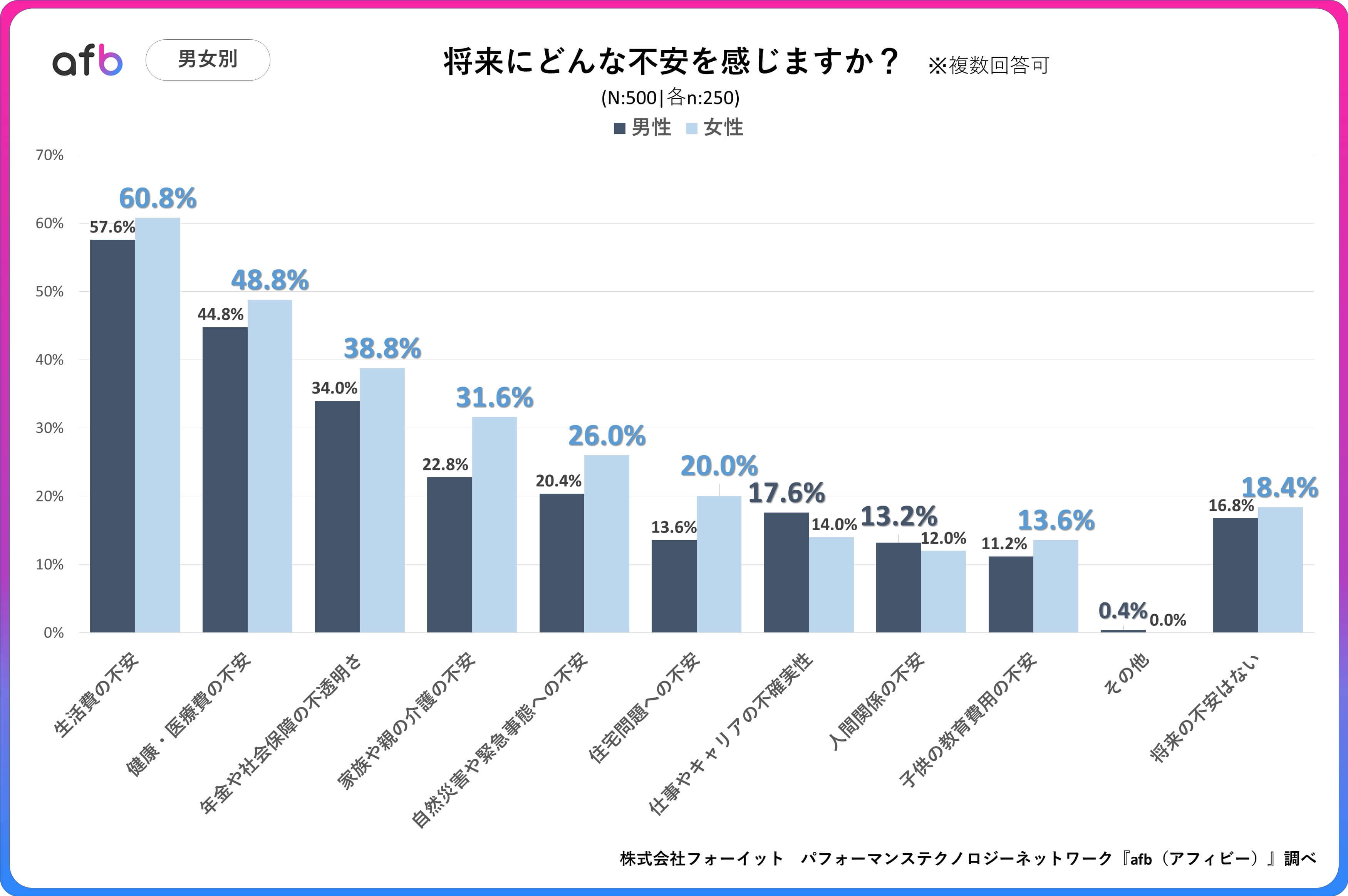 パフォーマンステクノロジーネットワーク「afb(アフィビー)」の開発運用をおこなう株式会社フォーイットは、全国の20代~60代までの男女500人を対象に将来の不安に関するアンケートを実施し、年代別・男女別等の特徴についてまとめました。