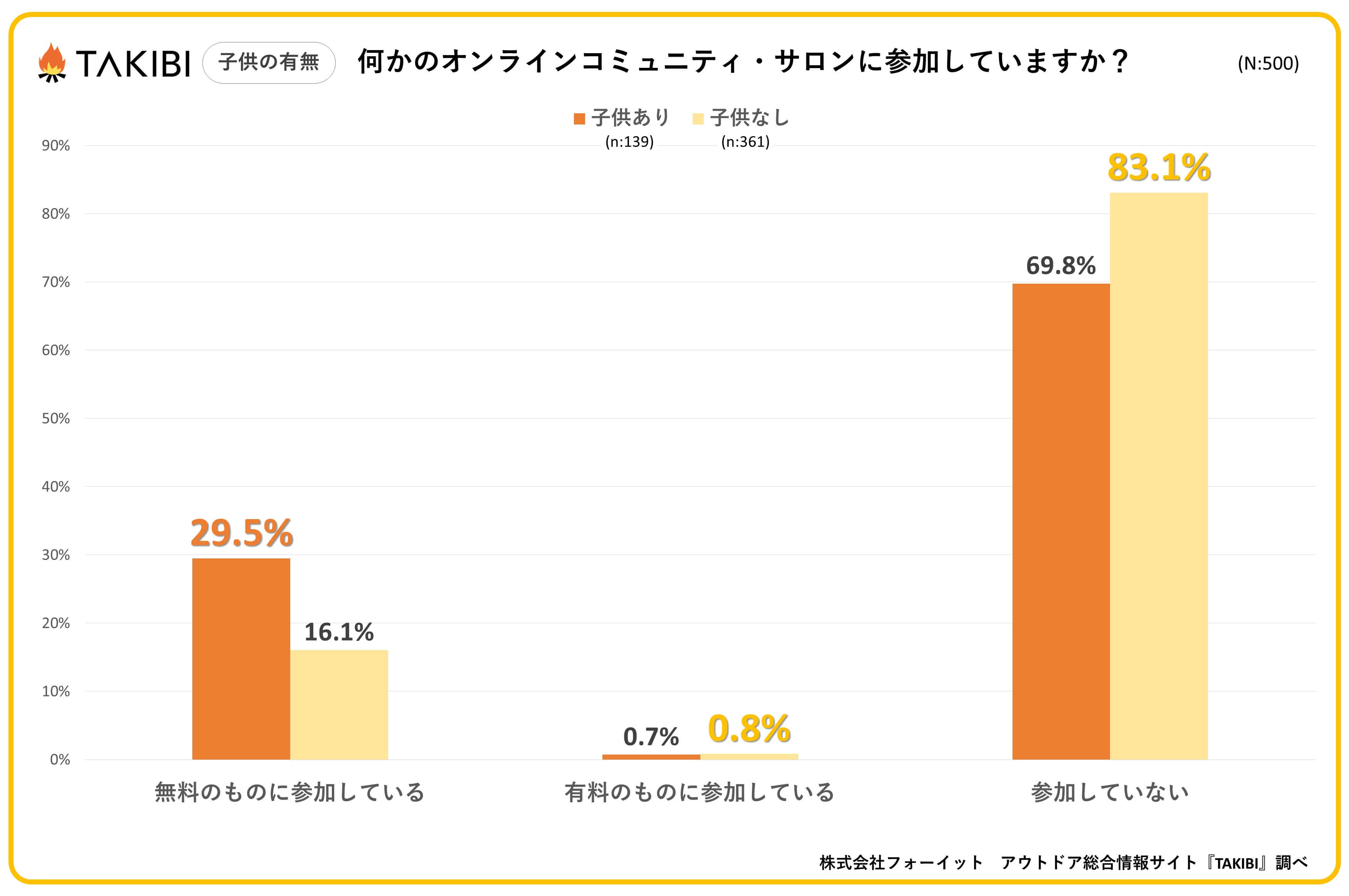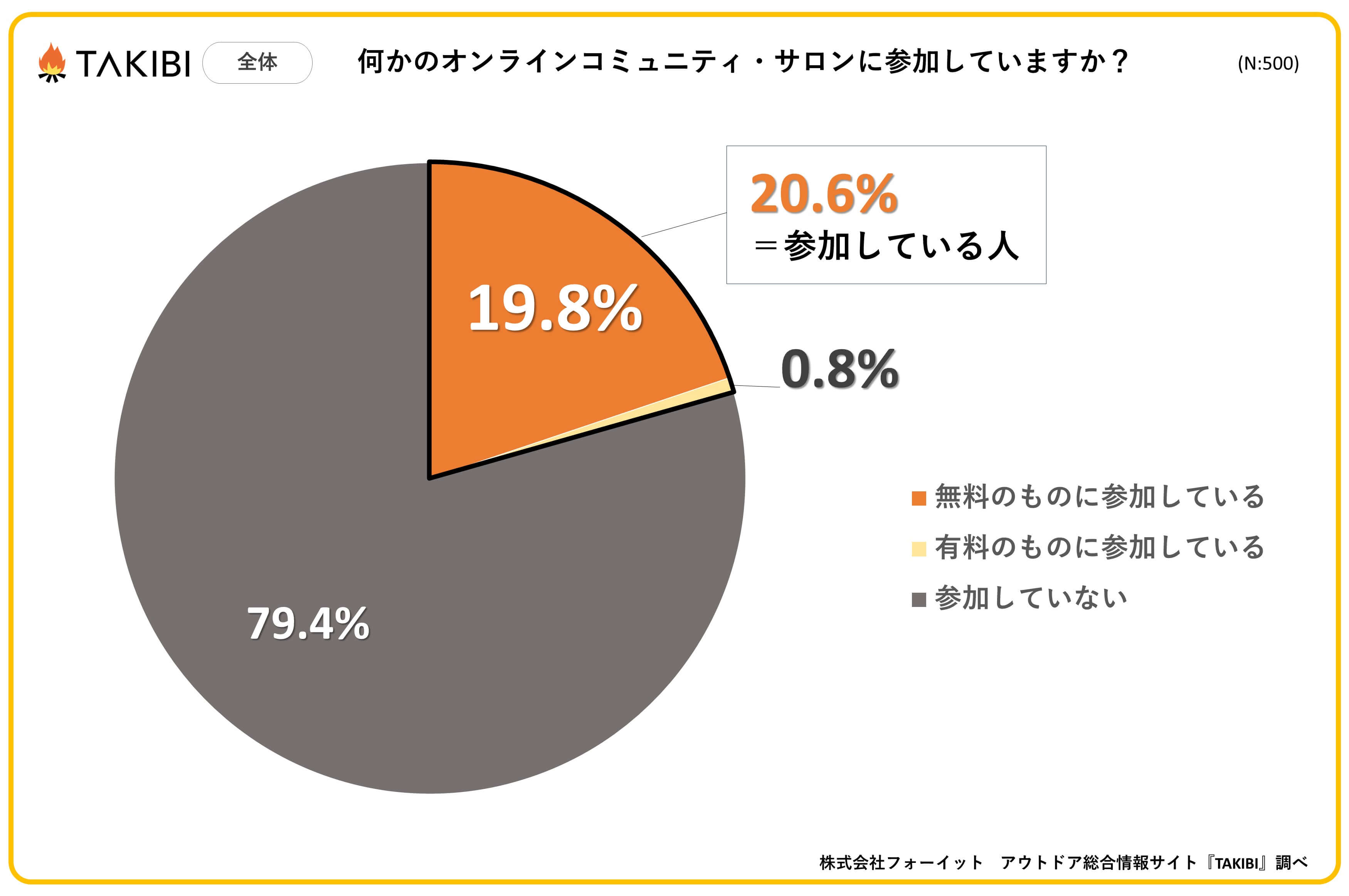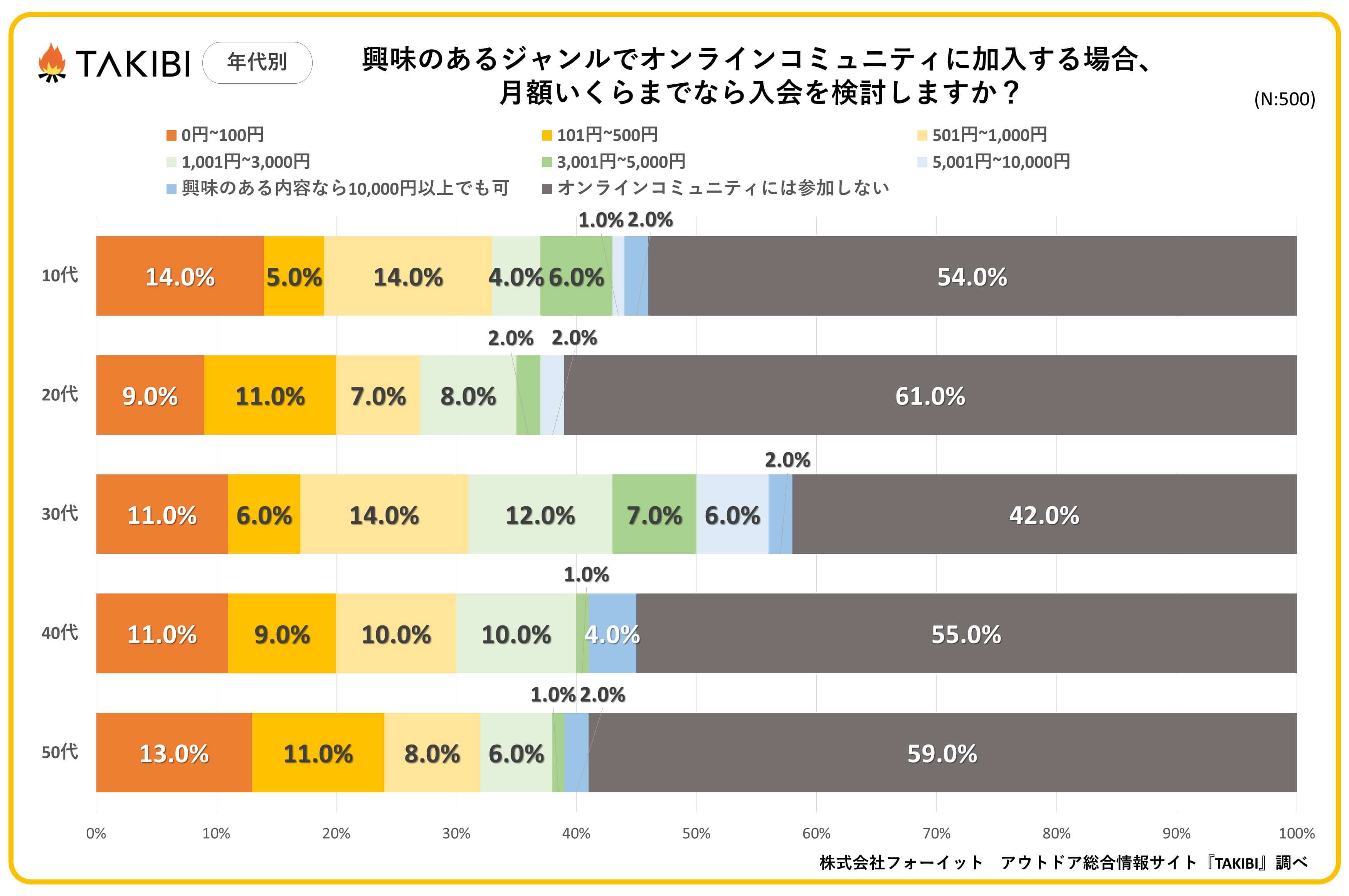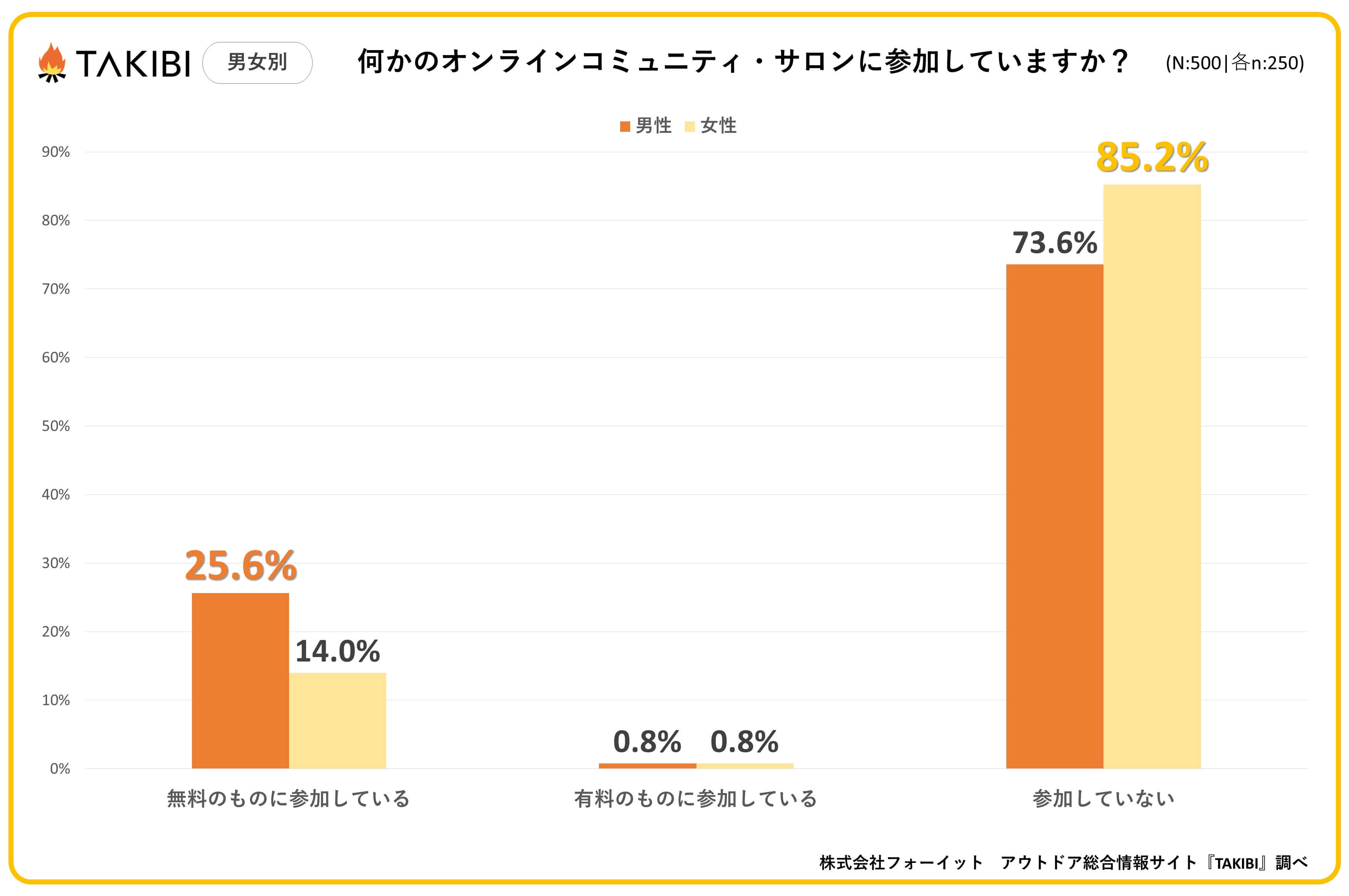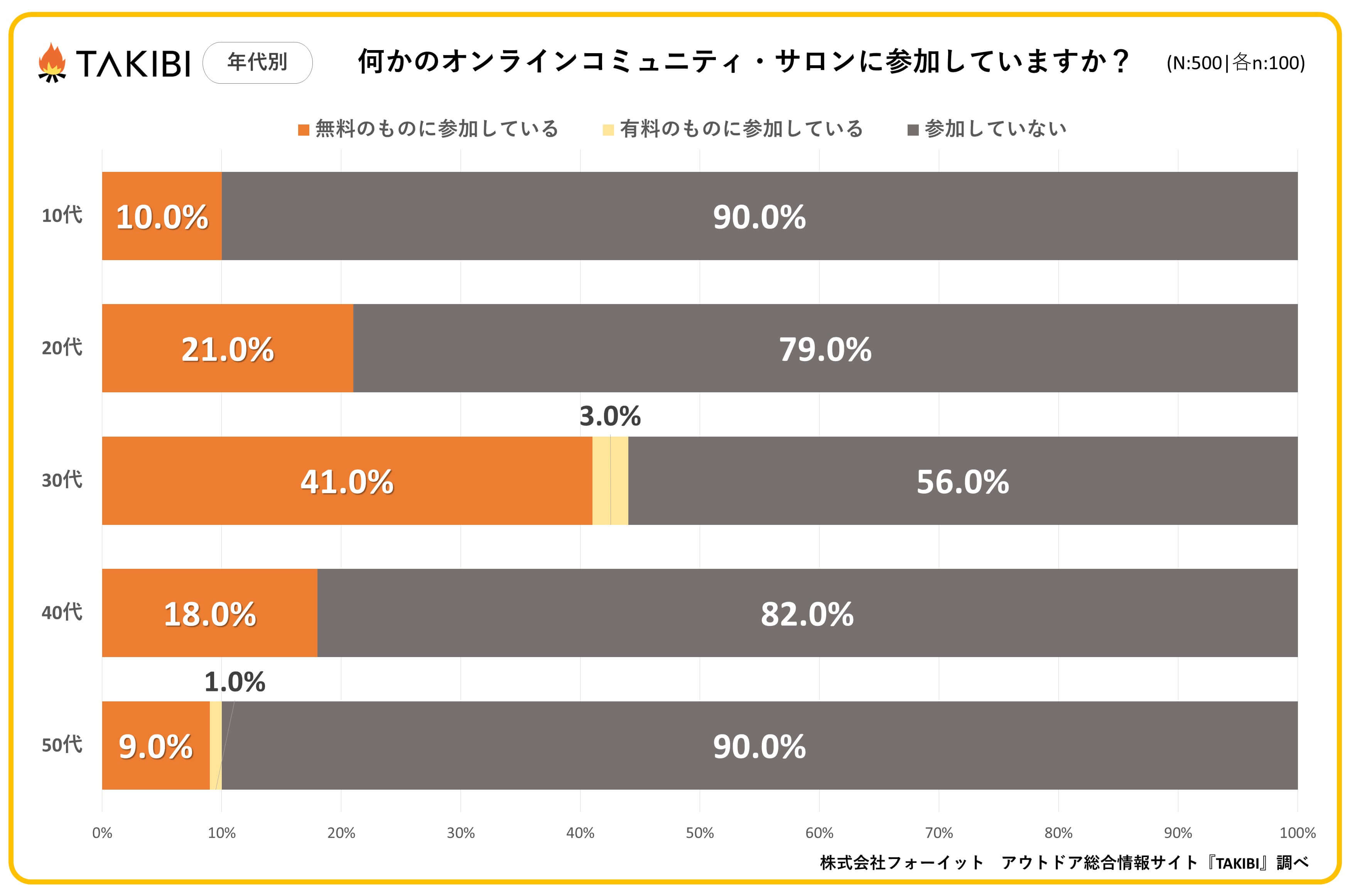 キャンプやグランピングを中心としたアウトドア総合情報サイト「TAKIBI」の運営をおこなう株式会社フォーイットは、全国の10代~50代までの男女500人を対象にオンラインコミュニティに関するアンケートを実施し、男女別・年代別等の特徴についてまとめました。