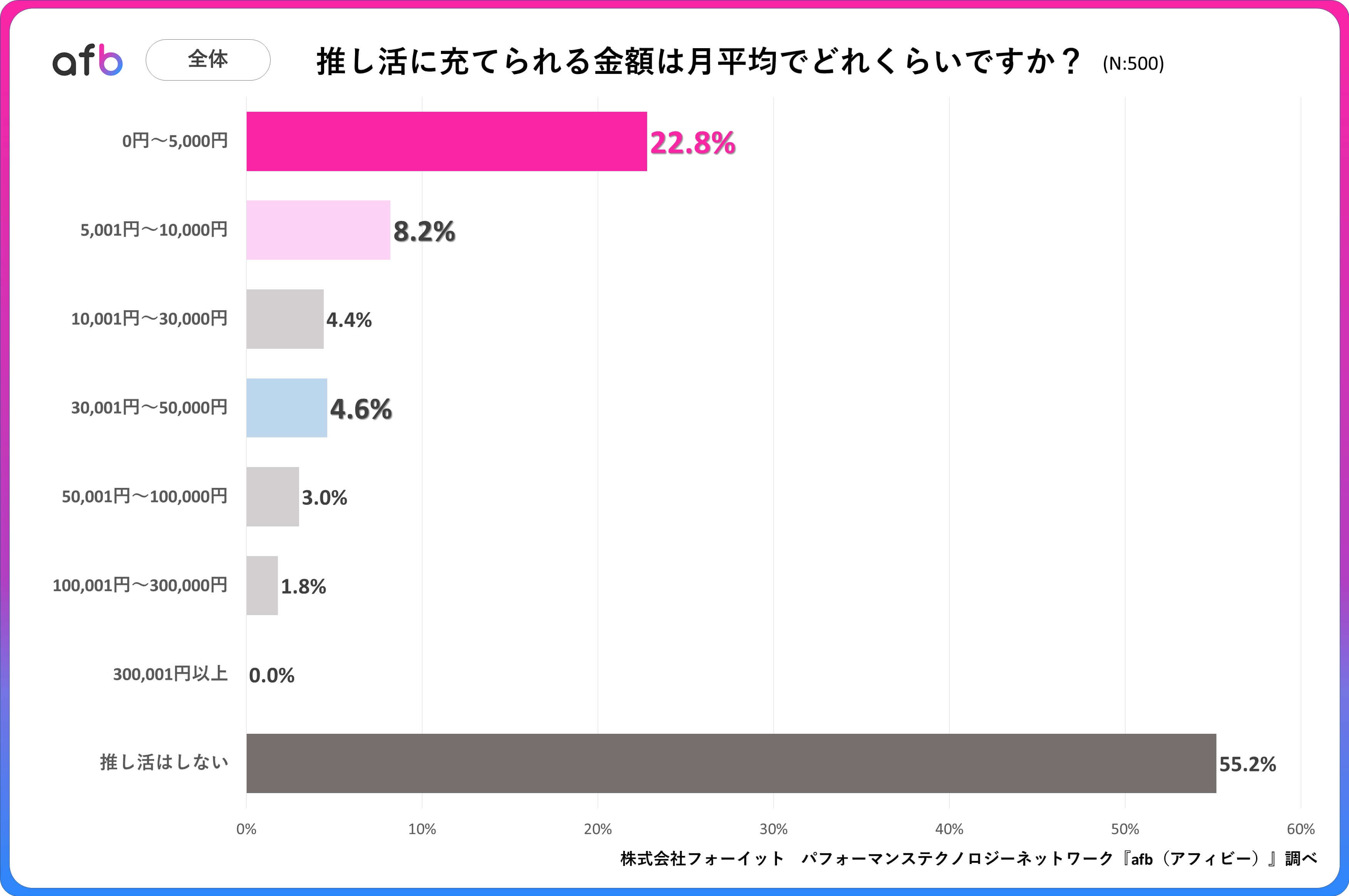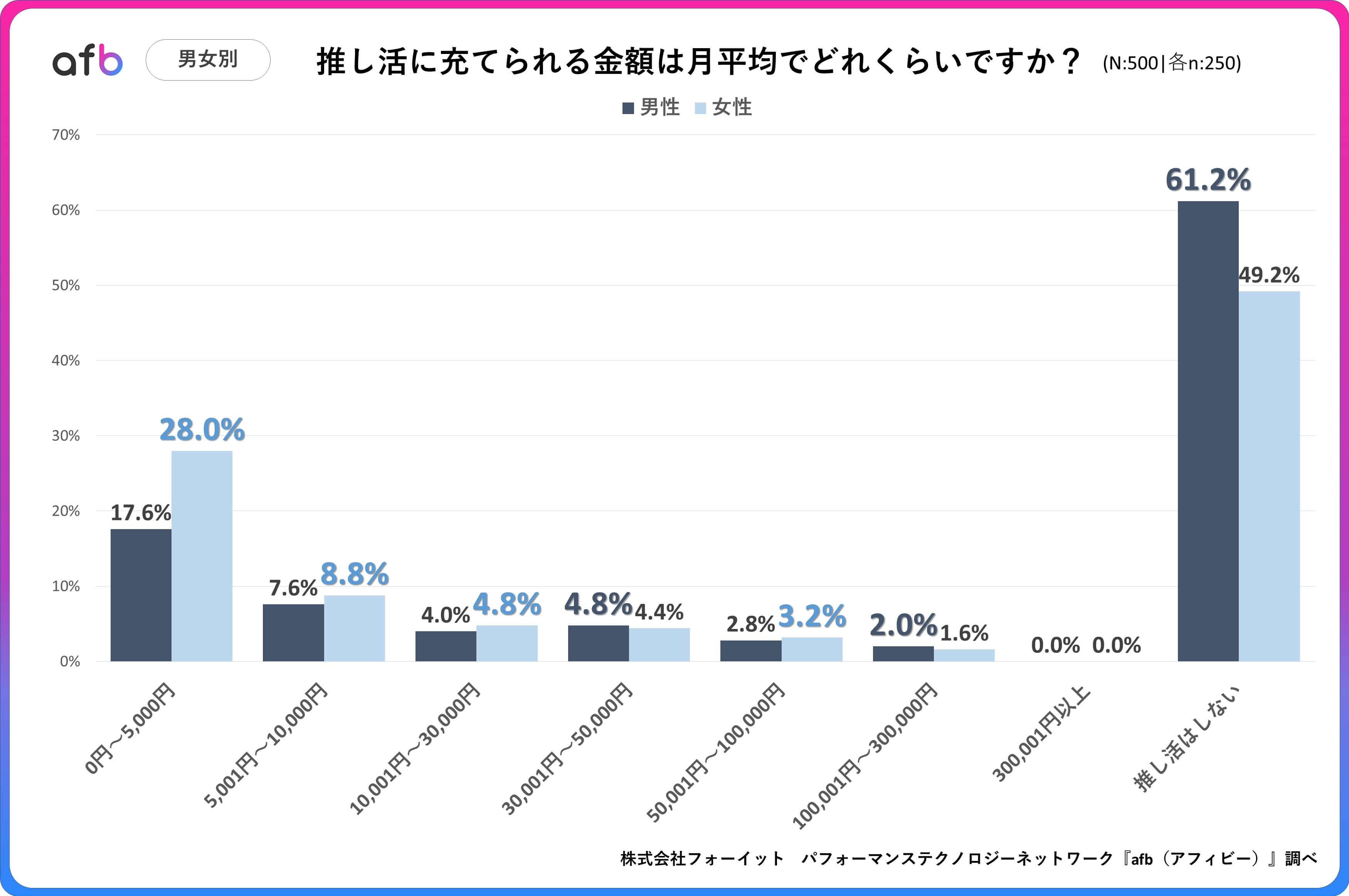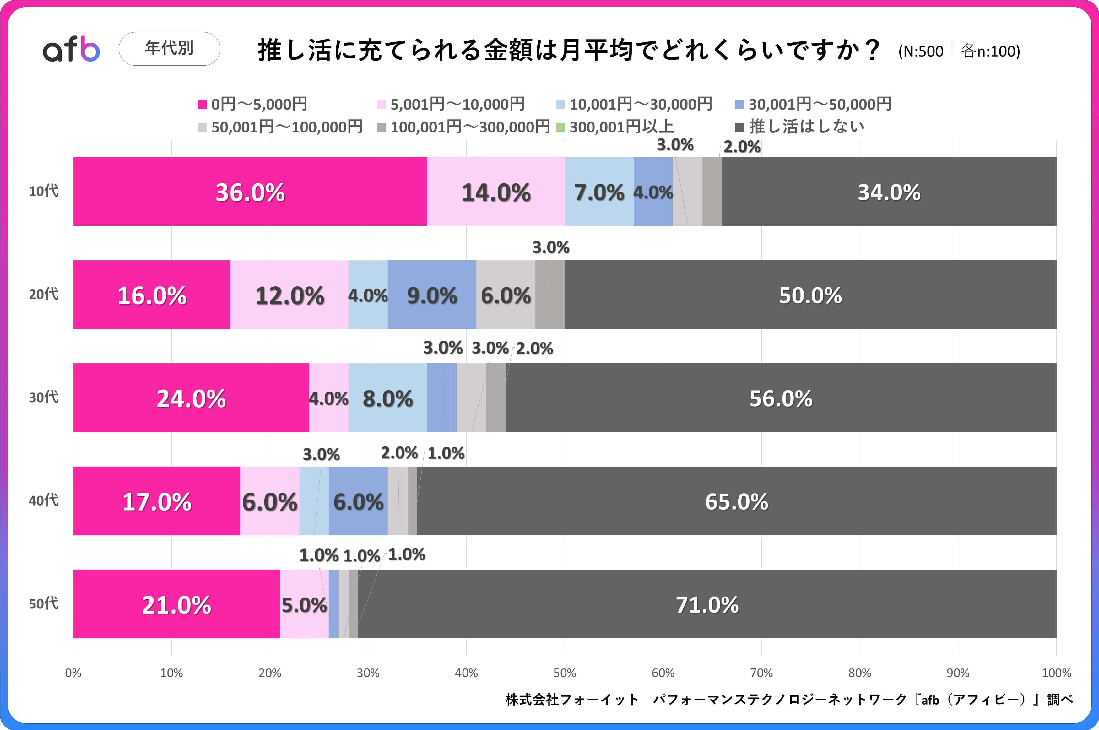パフォーマンステクノロジーネットワーク「afb(アフィビー)」の開発運用をおこなう株式会社フォーイットは、全国の10代~50代までの男女500人を対象に推し活に関するアンケートを実施し、年代別・男女別等の特徴についてまとめました。