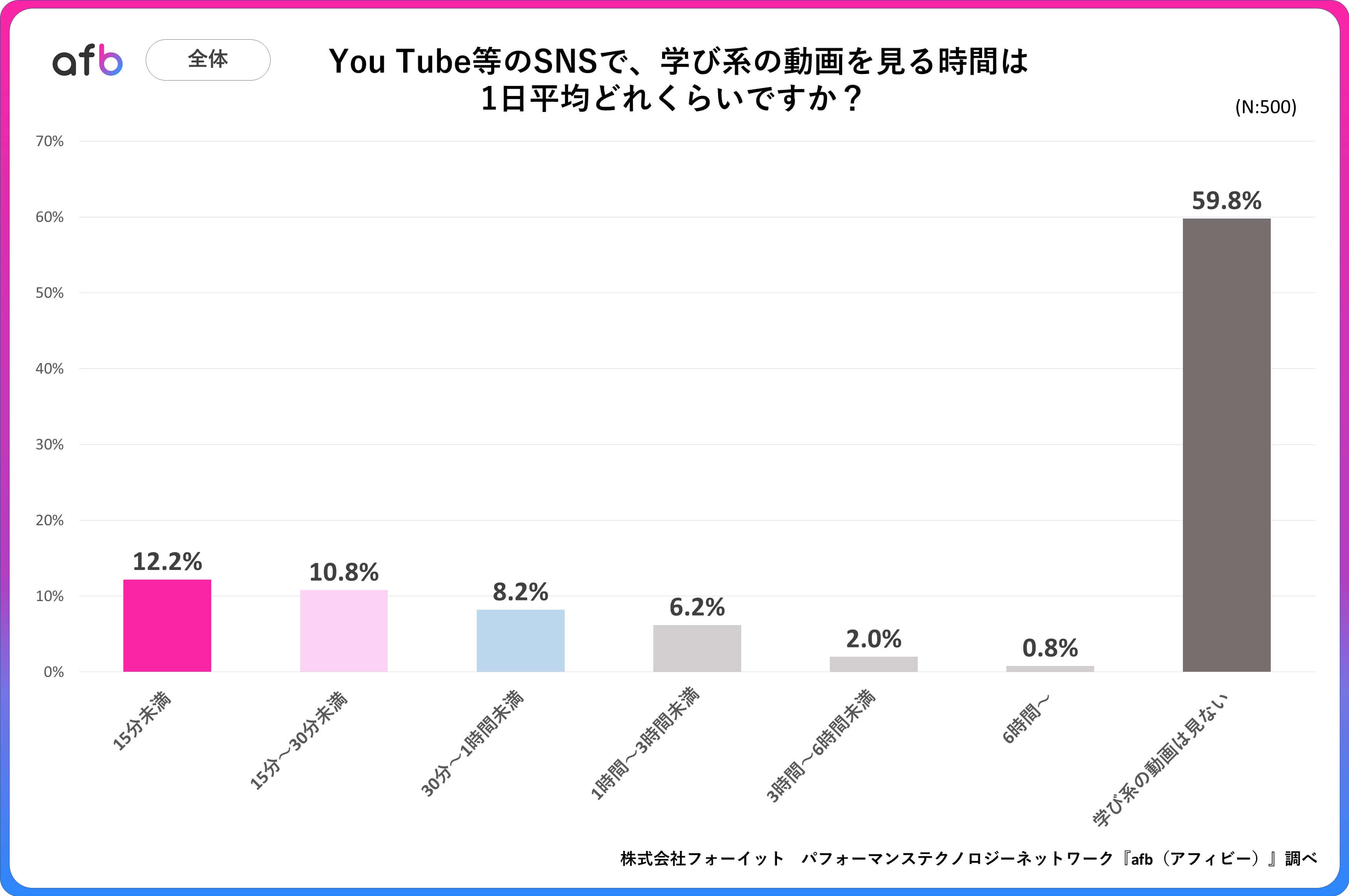 全国の10代〜80代の男女を対象に、「You Tube等のSNSで、学び系の動画を見る時間は1日平均どれくらいですか?」というアンケートを実施したところ、最も多かった回答は「15分未満」で12.2%でした。次いで、「15分〜30分未満」が10.8%、「30分〜1時間未満」が8.2%で続くという結果になりました。また、「学び系の動画は見ない」と回答した方は59.8%でした。