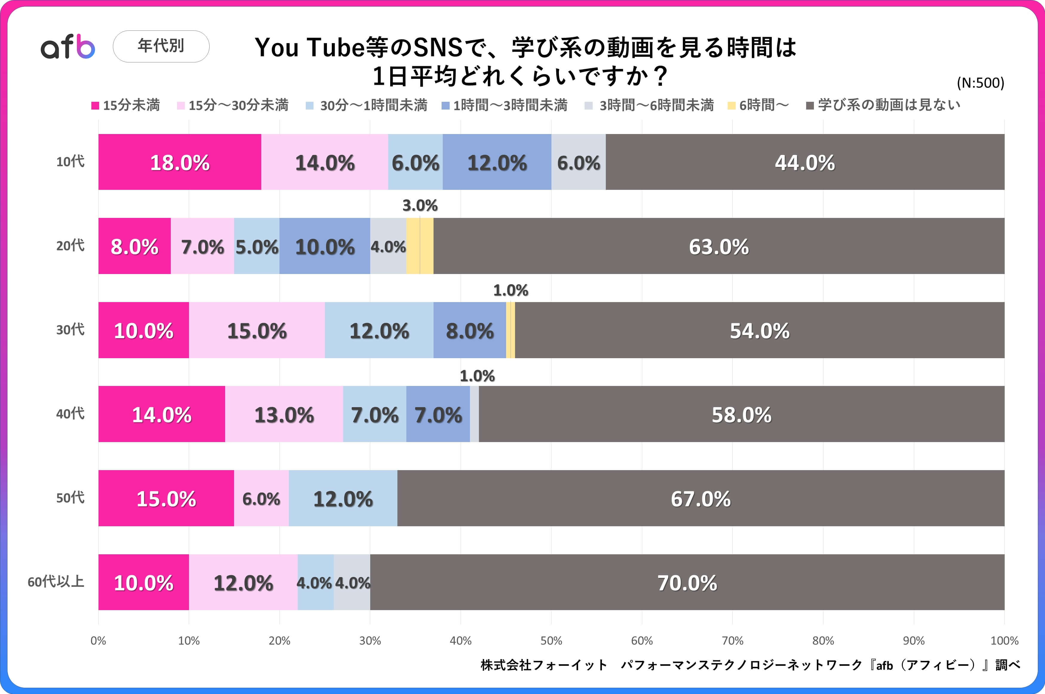 パフォーマンステクノロジーネットワーク「afb(アフィビー)」< https://www.afi-b.com/ >の開発運用をおこなう株式会社フォーイットは、全国の10代~80代までの男女500人を対象に動画視聴に関するアンケートを実施し、年代別・男女別等の特徴についてまとめました。