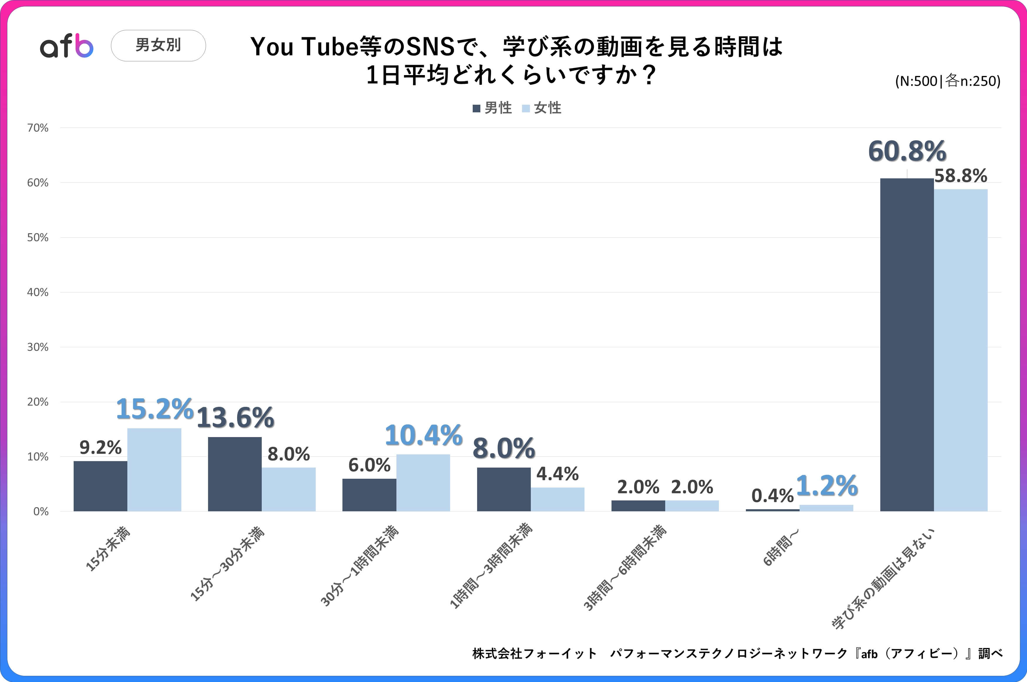 男女別で見ると、全体としてSNSで学び系の動画を見ている方はわずかに女性の方が多いという結果でした。その内訳は「15分未満」、「30分〜1時間未満」、「6時間〜」では女性が、「15分〜30分未満」、「1時間〜3時間未満」では男性の回答率が高くなっており、性別によって明確な差があるというわけではないようです。