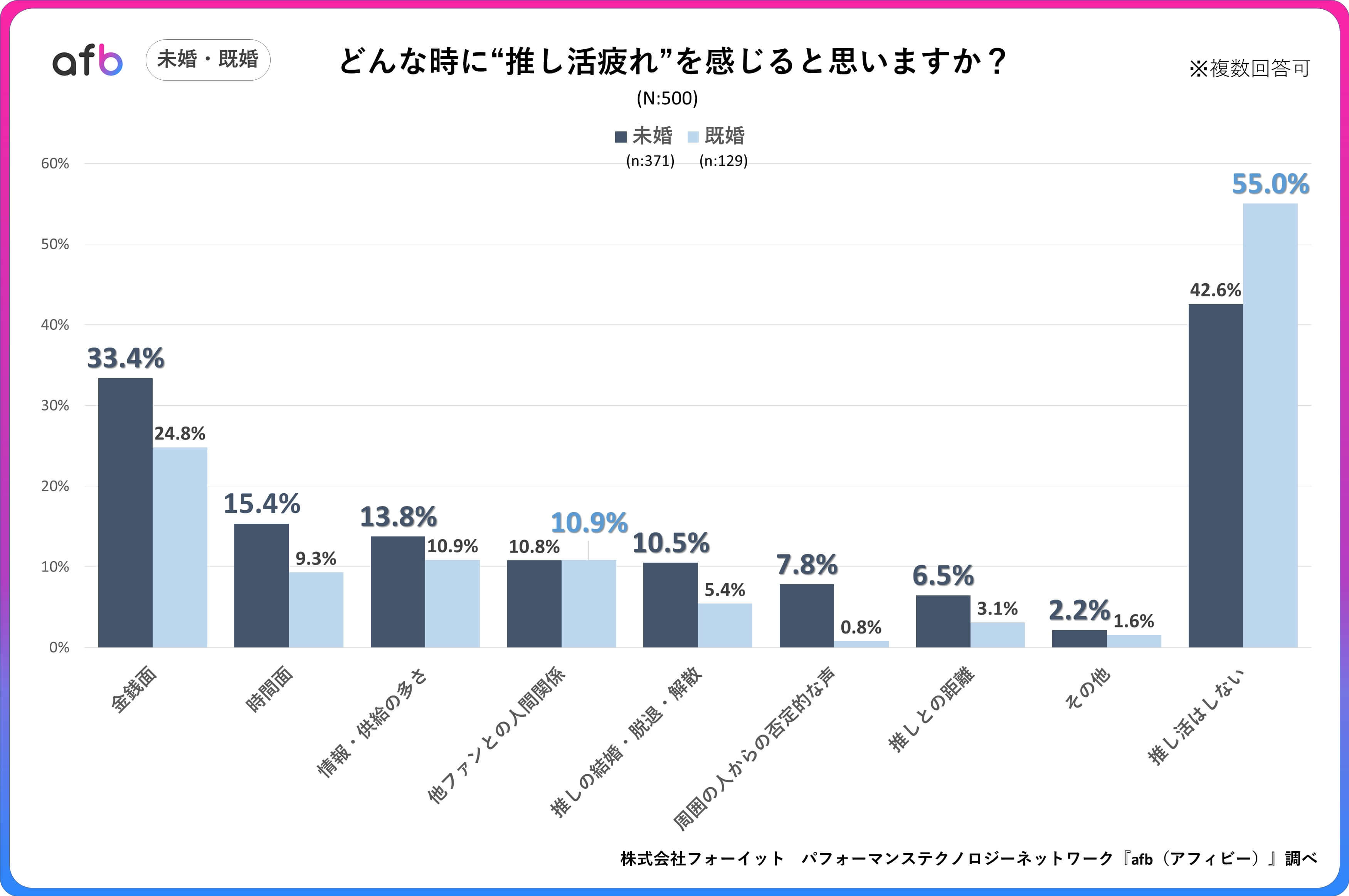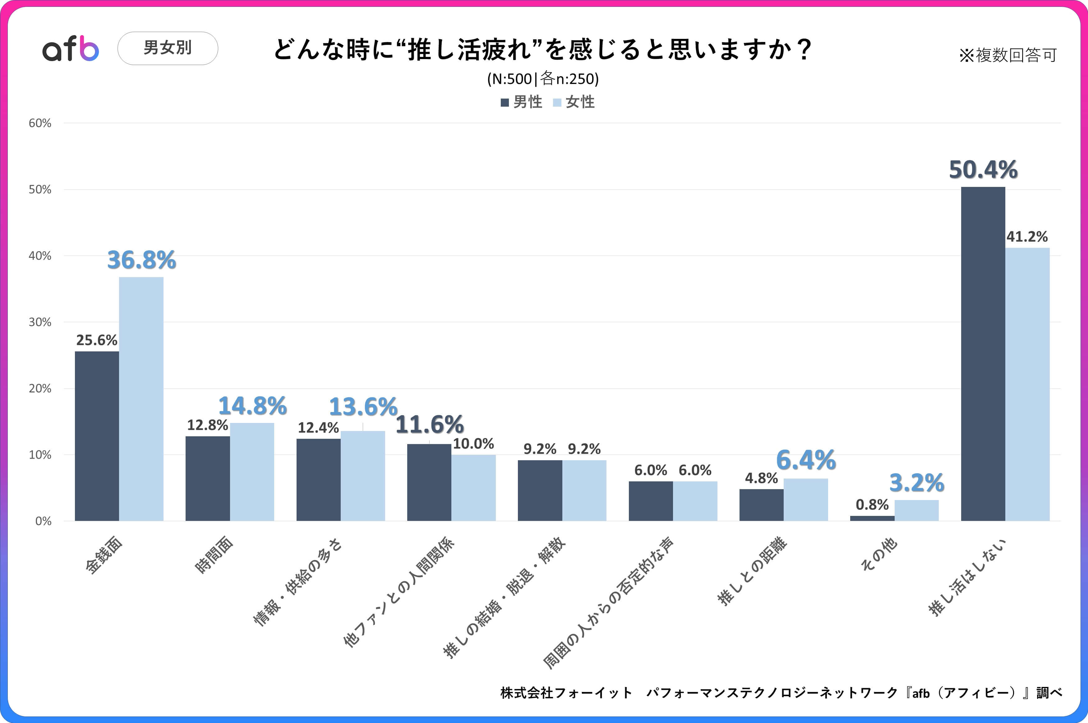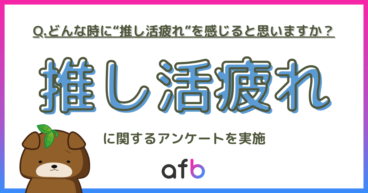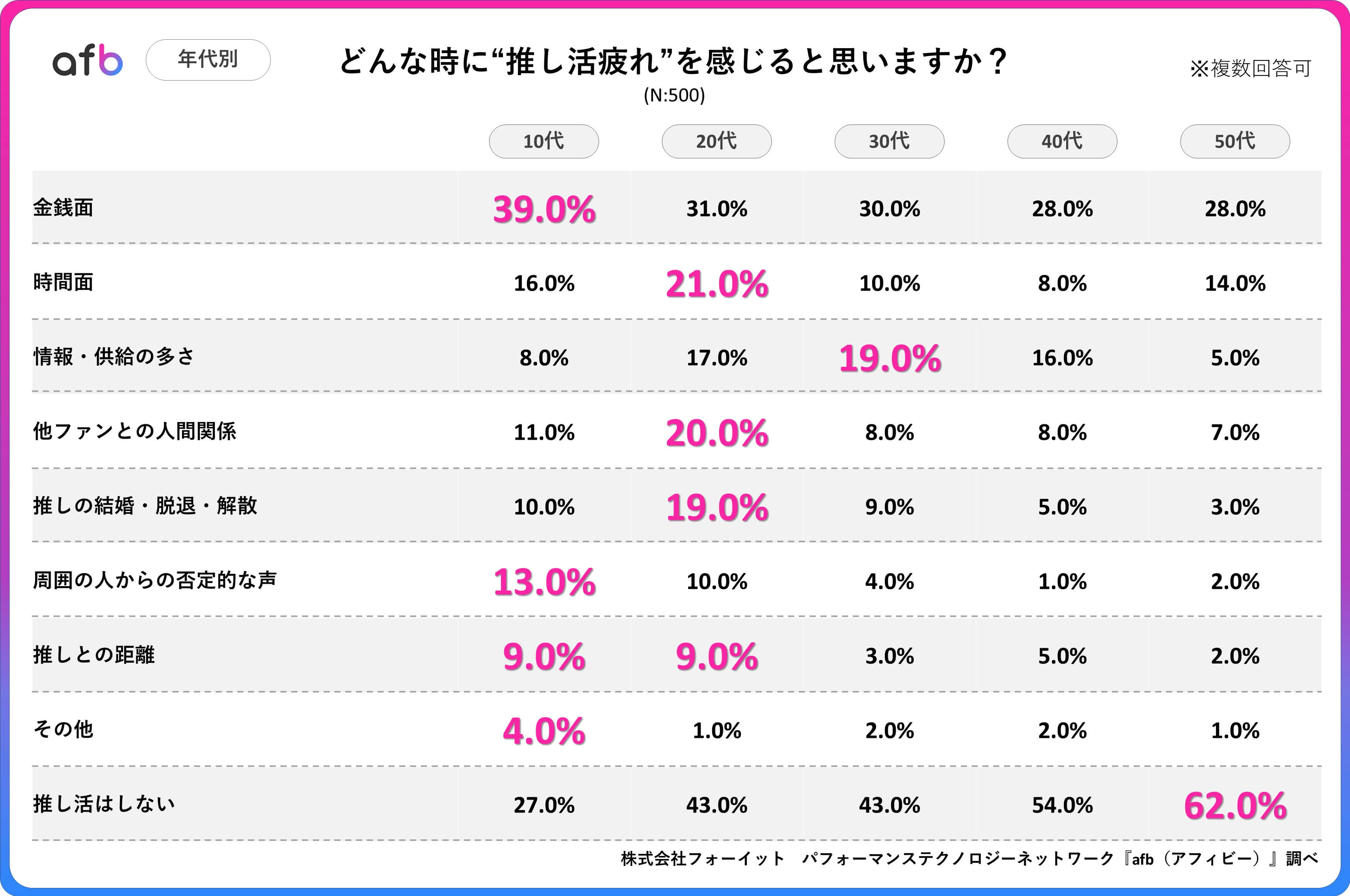 パフォーマンステクノロジーネットワーク「afb(アフィビー)」の開発運用をおこなう株式会社フォーイットは、全国の10代~50代までの男女500人を対象に推し活に関するアンケートを実施し、年代別・男女別等の特徴についてまとめました。