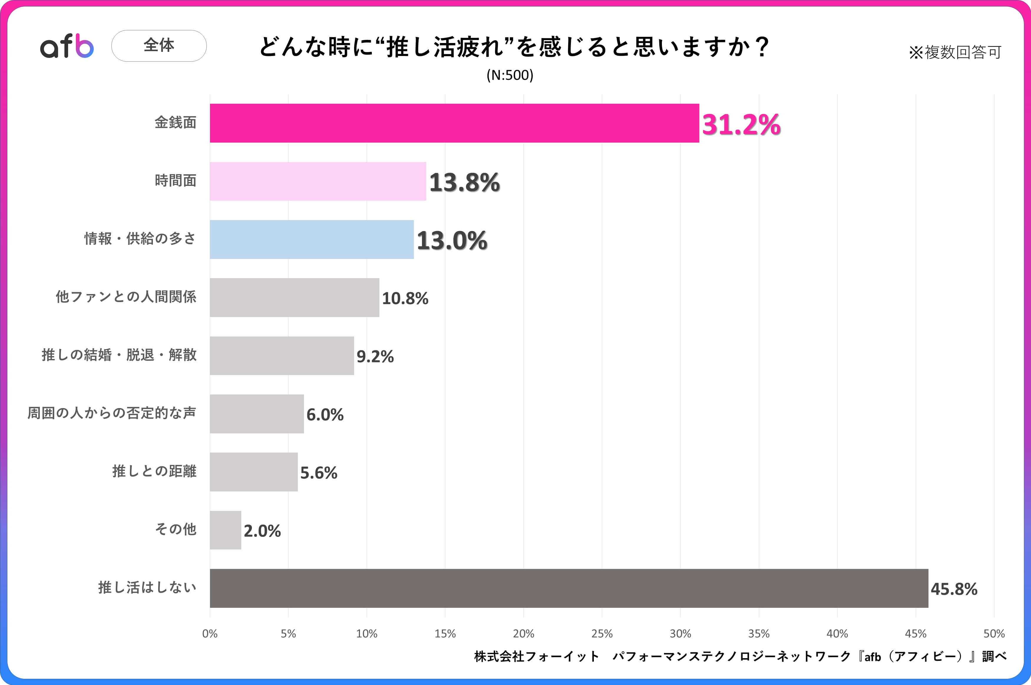 全国の10代〜50代の男女を対象に、「どんな時に“推し活疲れ”を感じると思いますか?」というアンケートを実施したところ、最も多かった回答は「金銭面」で31.2%でした。次いで、「時間面」が13.8%、「情報・供給の多さ」が13.0%で続くという結果になっています。また、その他として「情報が得られない時」や、そもそも「疲れない」といった回答が得られました。「推し活はしない」と回答した方は45.8%で、50%以上の方が推し活をしていることが明らかになりました。