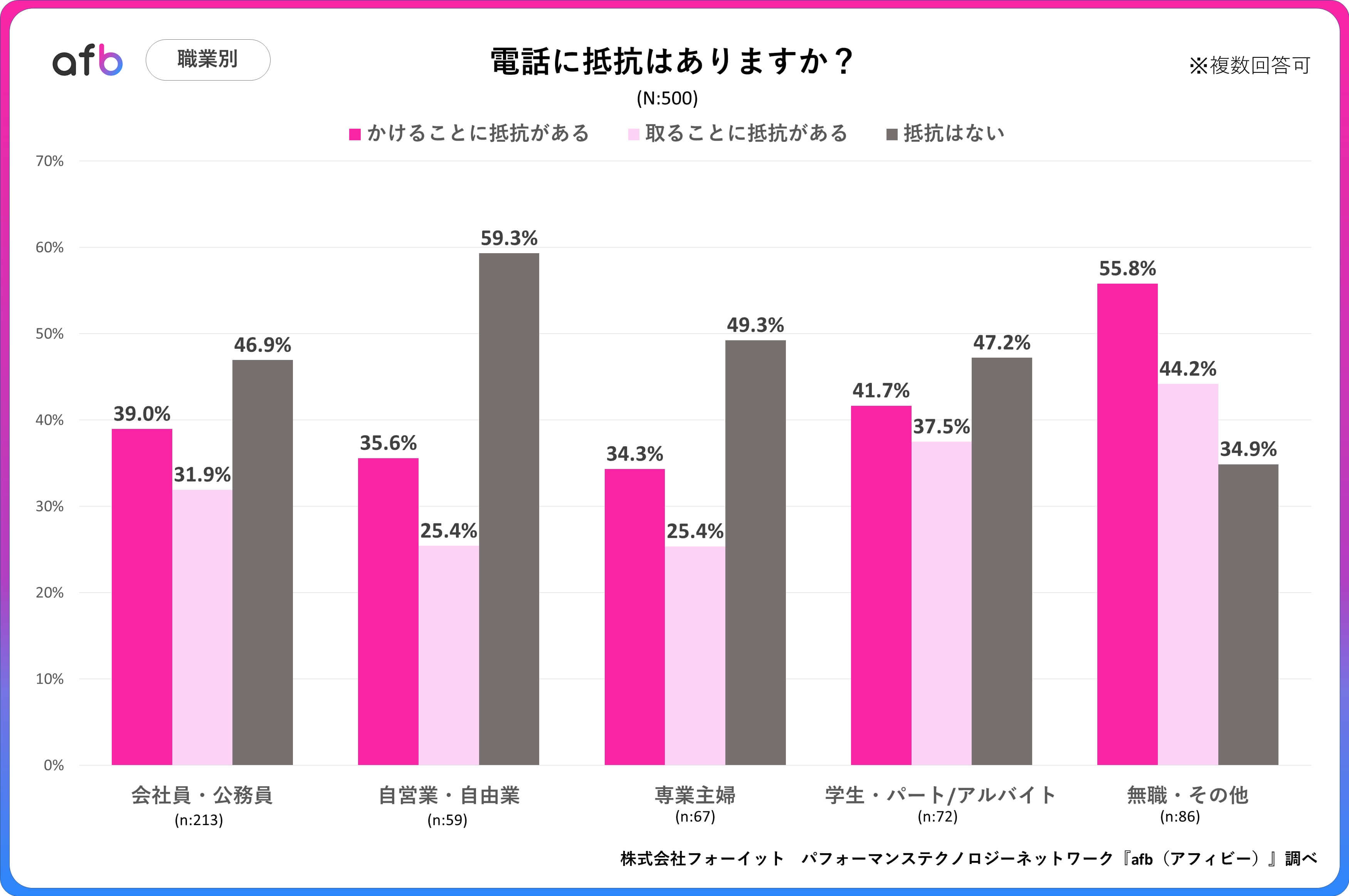 職業別で見ると、抵抗があると回答した方は「会社員・公務員」、「専業主婦」、「学生・パート/アルバイト」では50%程度だったのに対して、「自営業・自由業」では40%に留まりました。職業や業務内容にもよりますが、コロナ禍を経た現在では、仕事上のやりとりなどもメールやメッセージアプリなどオンラインツールの使用機会が増えたことで電話を使用することが少なくなっているため、電話に抵抗があるという方が一定数いると推察されます。ただ、自営業の場合は業務の内容が多岐にわたり、例えば営業の架電から行政手続きなども全て自身で行わなければならないため、日常的に電話を使うことで抵抗がなくなっている方が多いのかもしれません。
