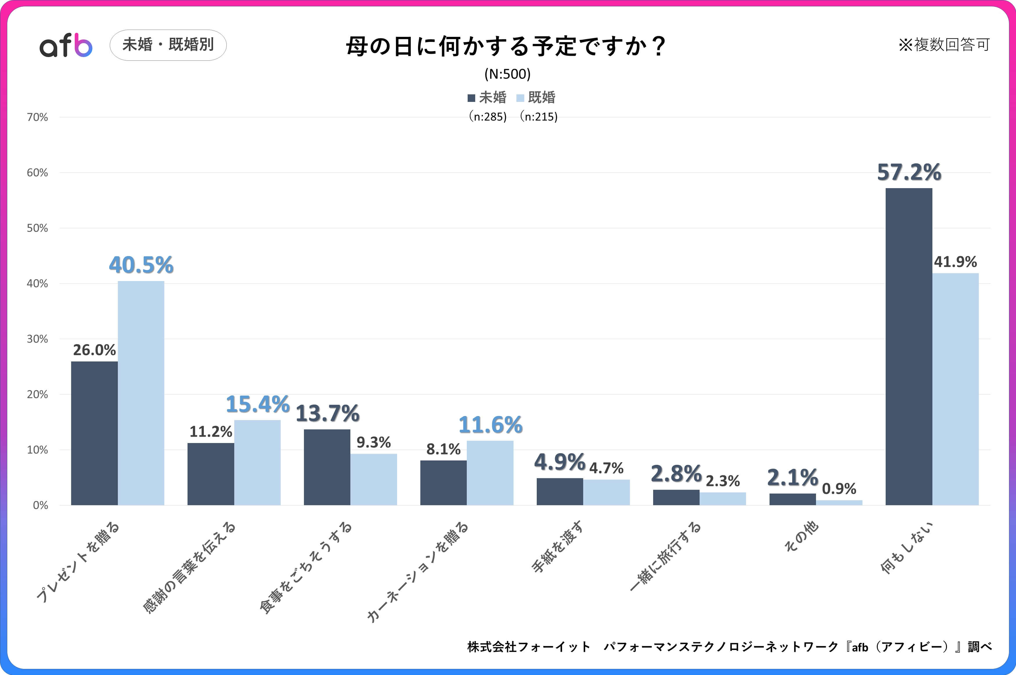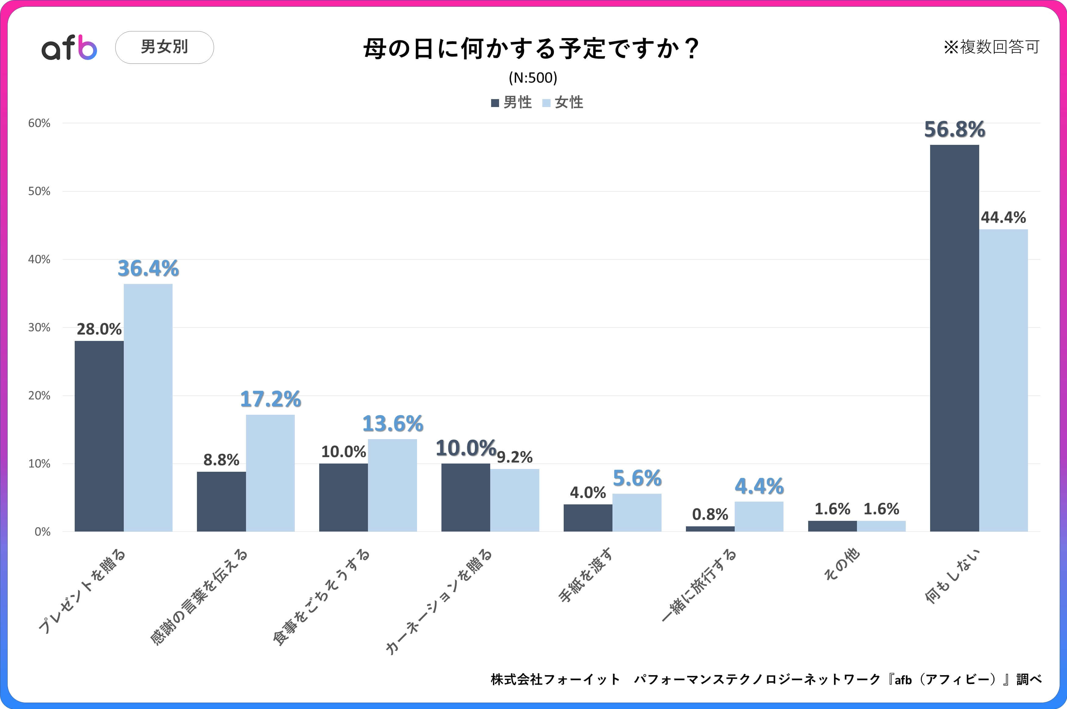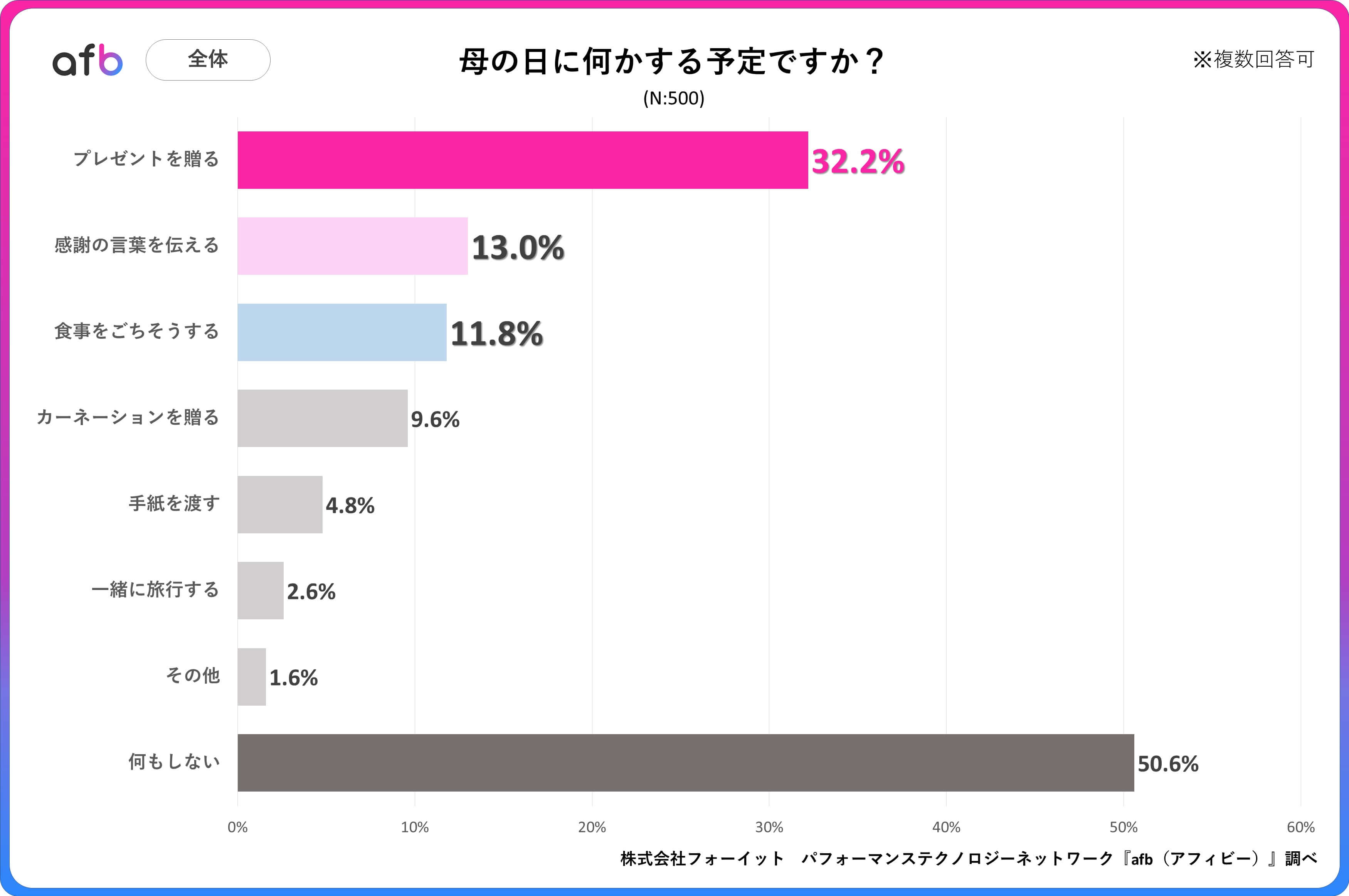 パフォーマンステクノロジーネットワーク「afb(アフィビー)」の開発運用をおこなう株式会社フォーイットは、全国の20代~60代までの男女500人を対象に母の日に関するアンケートを実施し、年代別等の特徴についてまとめました。