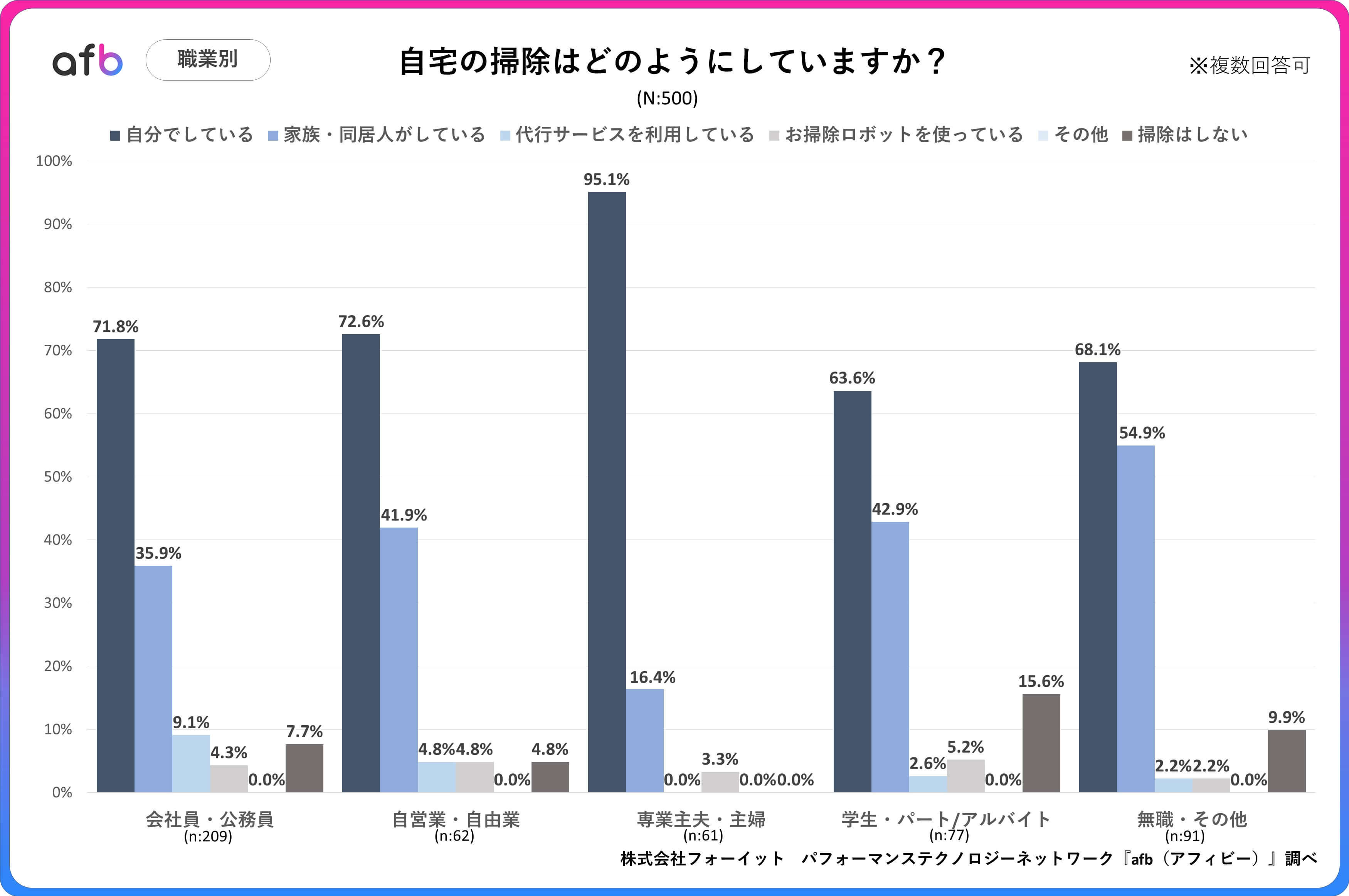 職業別に見ると、どの職業でも「自分でしている」という回答が最も多くなりましたが、特に「専業主夫・主婦」では95.1%と圧倒的な数字になっています。一方、「代行サービスを利用している」という方は、「会社員・公務員」で最も多く、9.1%となりました。