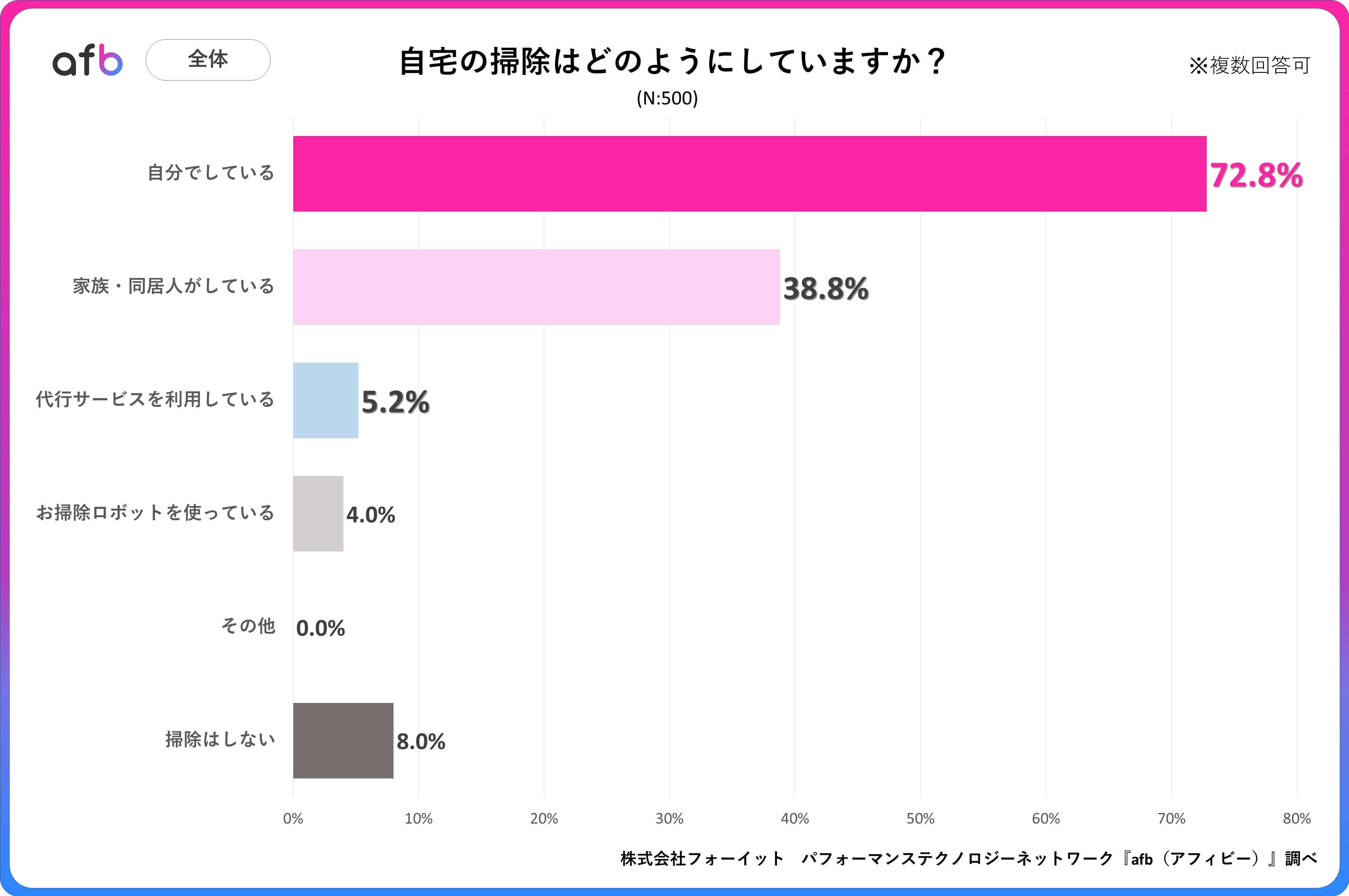 全国の20代~60代の男女を対象に、「自宅の掃除はどのようにしていますか?」というアンケートを実施したところ、最も多かった回答は「自分でしている」で72.8%でした。次いで、「家族・同居人がしている」が38.8%、「代行サービスを利用している」が5.2%で続くという結果になりました。また、「掃除はしない」と回答した方は8.0%でした。