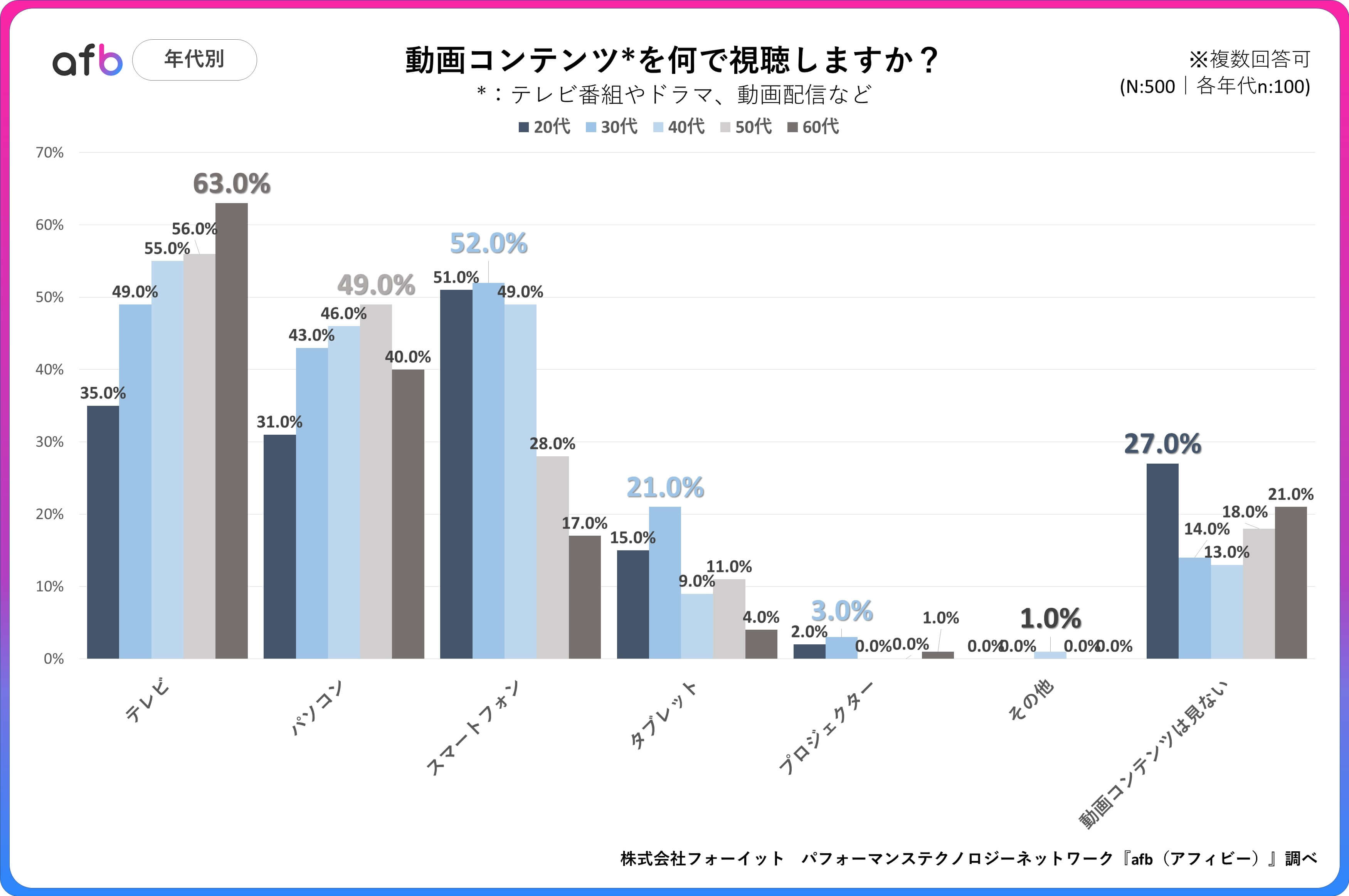 パフォーマンステクノロジーネットワーク「afb(アフィビー)」の開発運用をおこなう株式会社フォーイットは、全国の20代~60代までの男女500人を対象に暮らしに関するアンケートを実施し、年代別等の特徴についてまとめました。