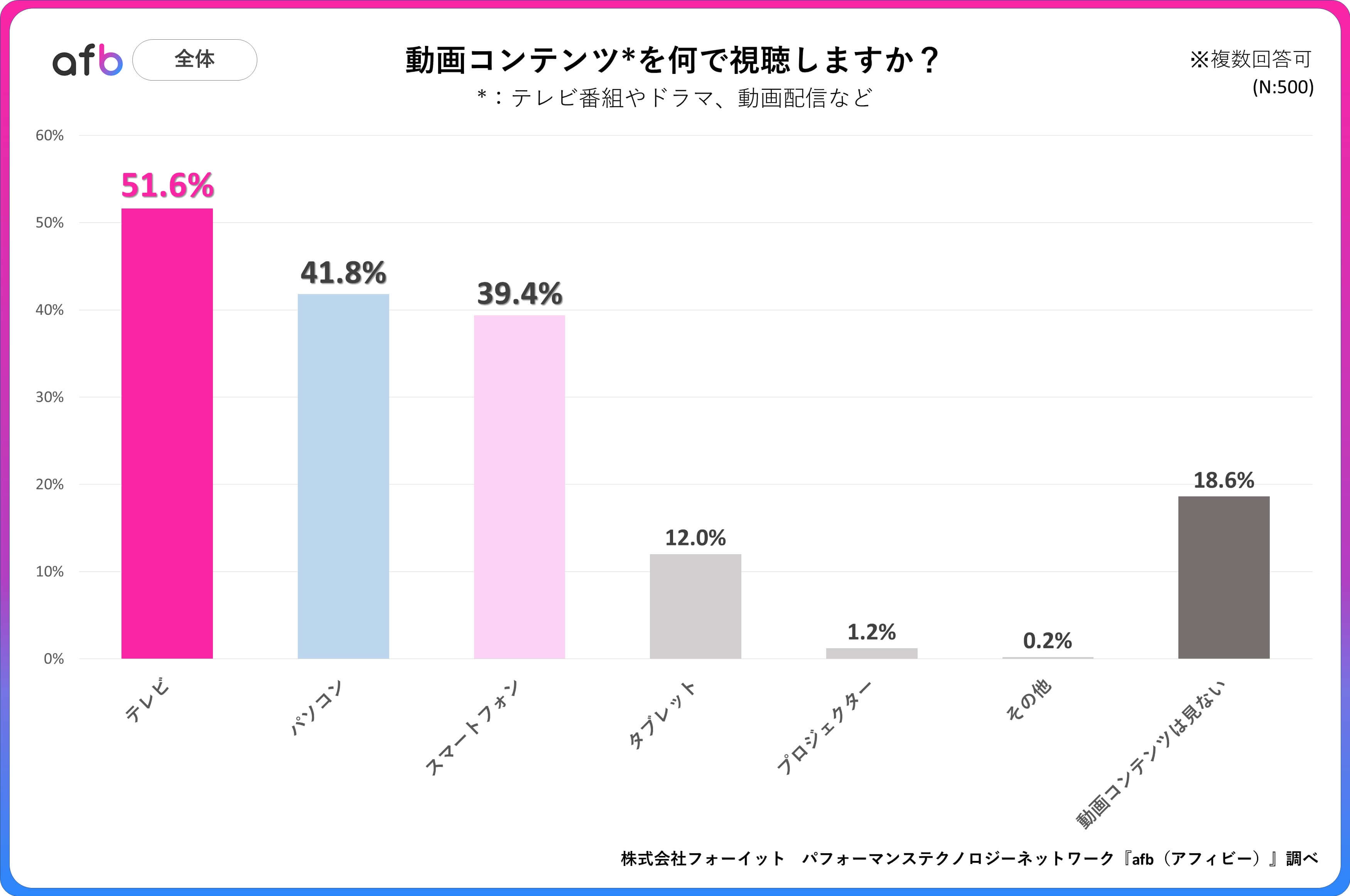 全国の20代~60代の男女を対象に、「動画コンテンツを何で視聴しますか?」というアンケートを実施したところ、最も多かった回答は「テレビ」で51.6%でした。次いで、「パソコン」が41.8%、「スマートフォン」が39.4%という結果になりました。また、「その他」の回答としては、「ゲームコンソール」などの回答が得られました。一方、「動画コンテンツは見ない」と回答した方は18.6%でした。