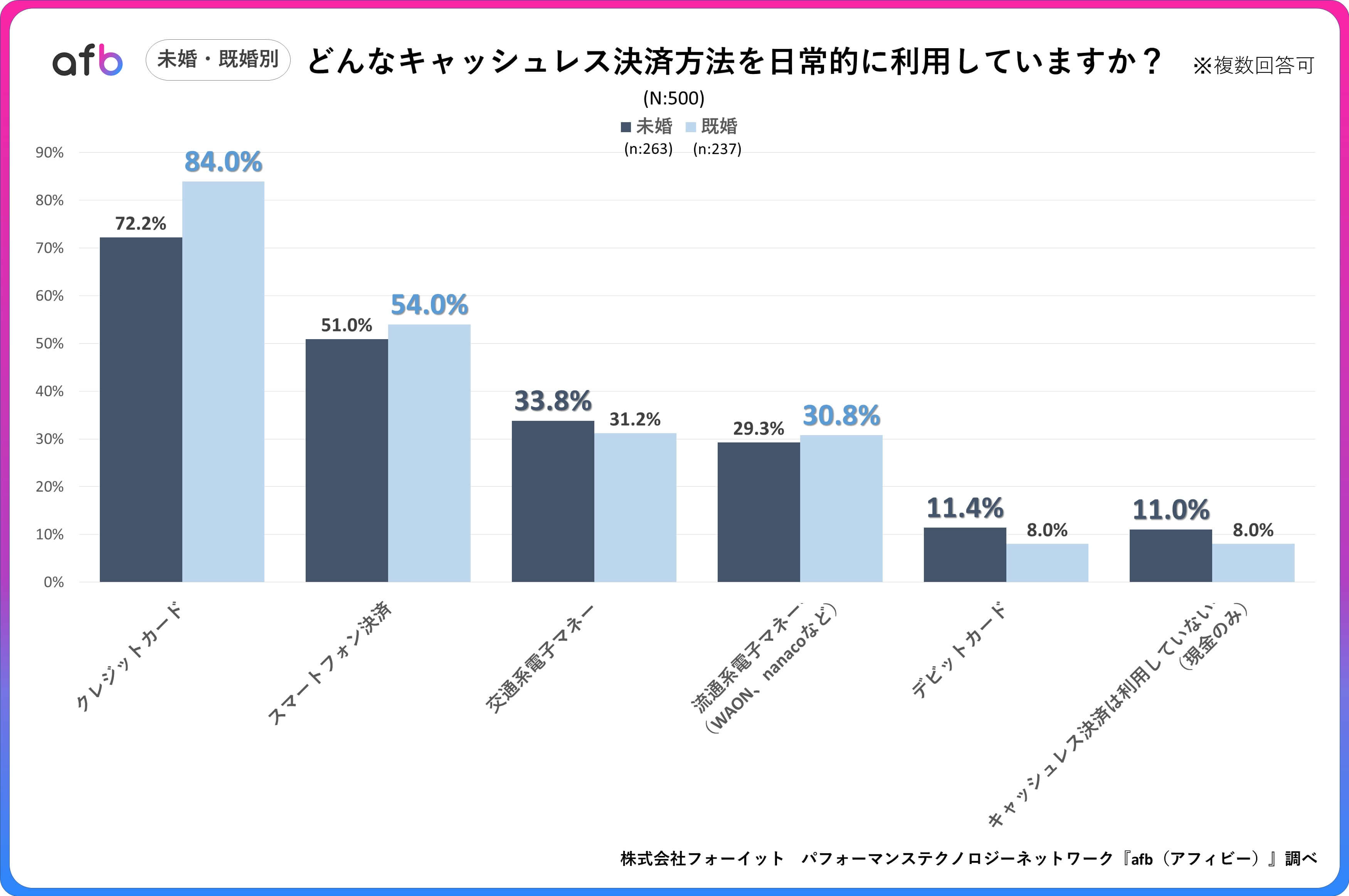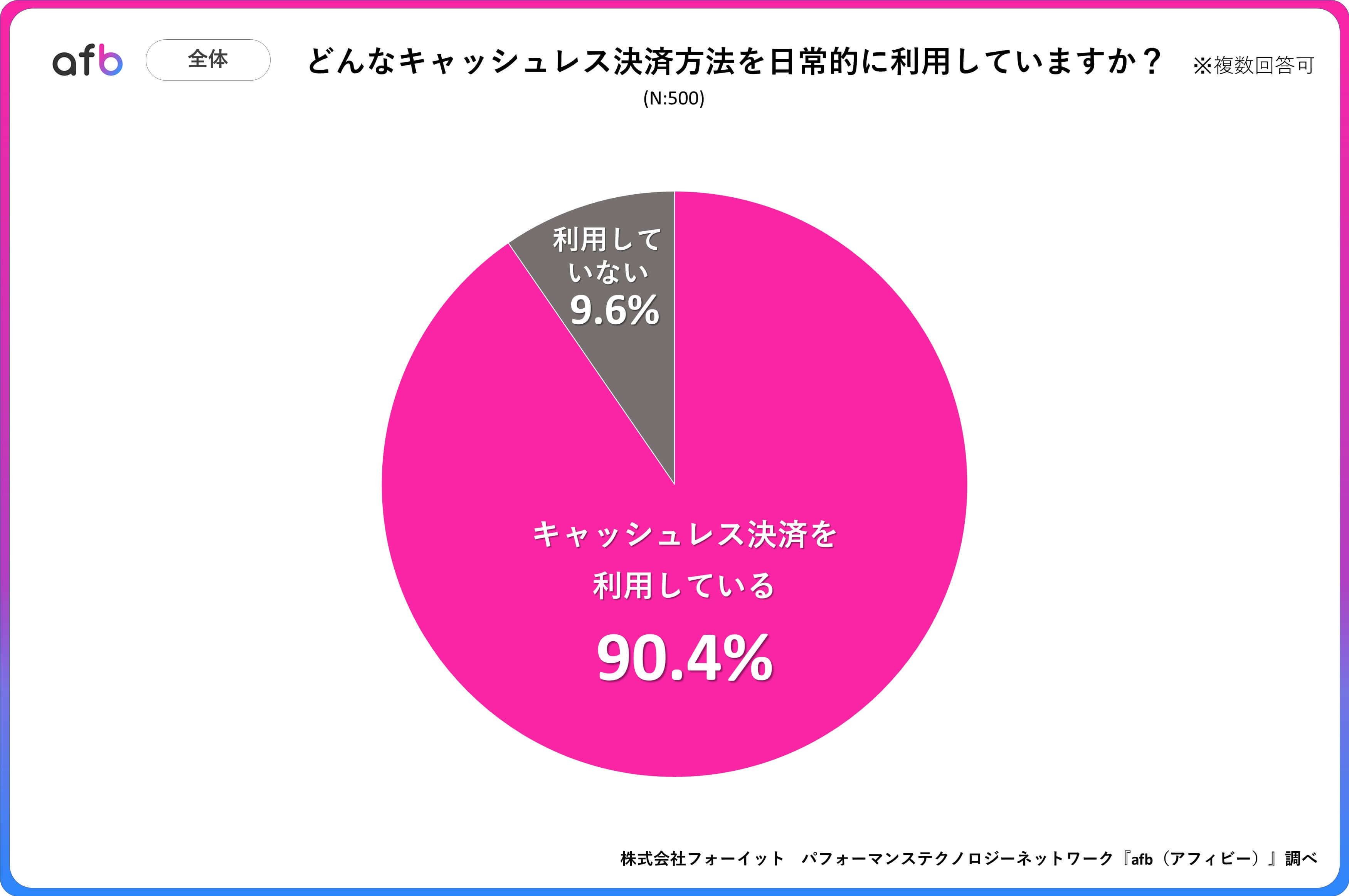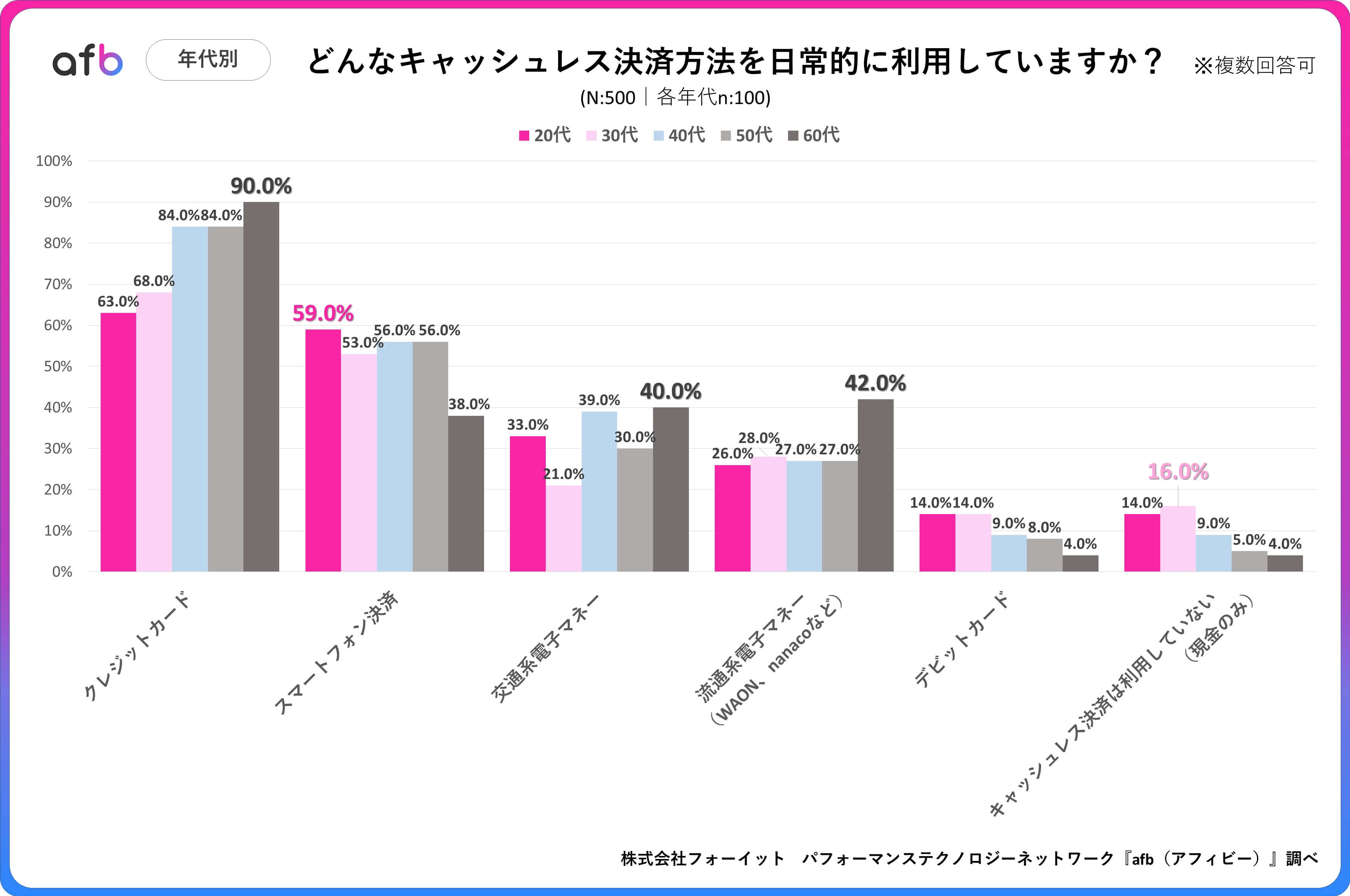 パフォーマンステクノロジーネットワーク「afb(アフィビー)」の開発運用をおこなう株式会社フォーイットは、全国の20代~60代までの男女500人を対象にキャッシュレス決済に関するアンケートを実施し、年代別等の特徴についてまとめました。