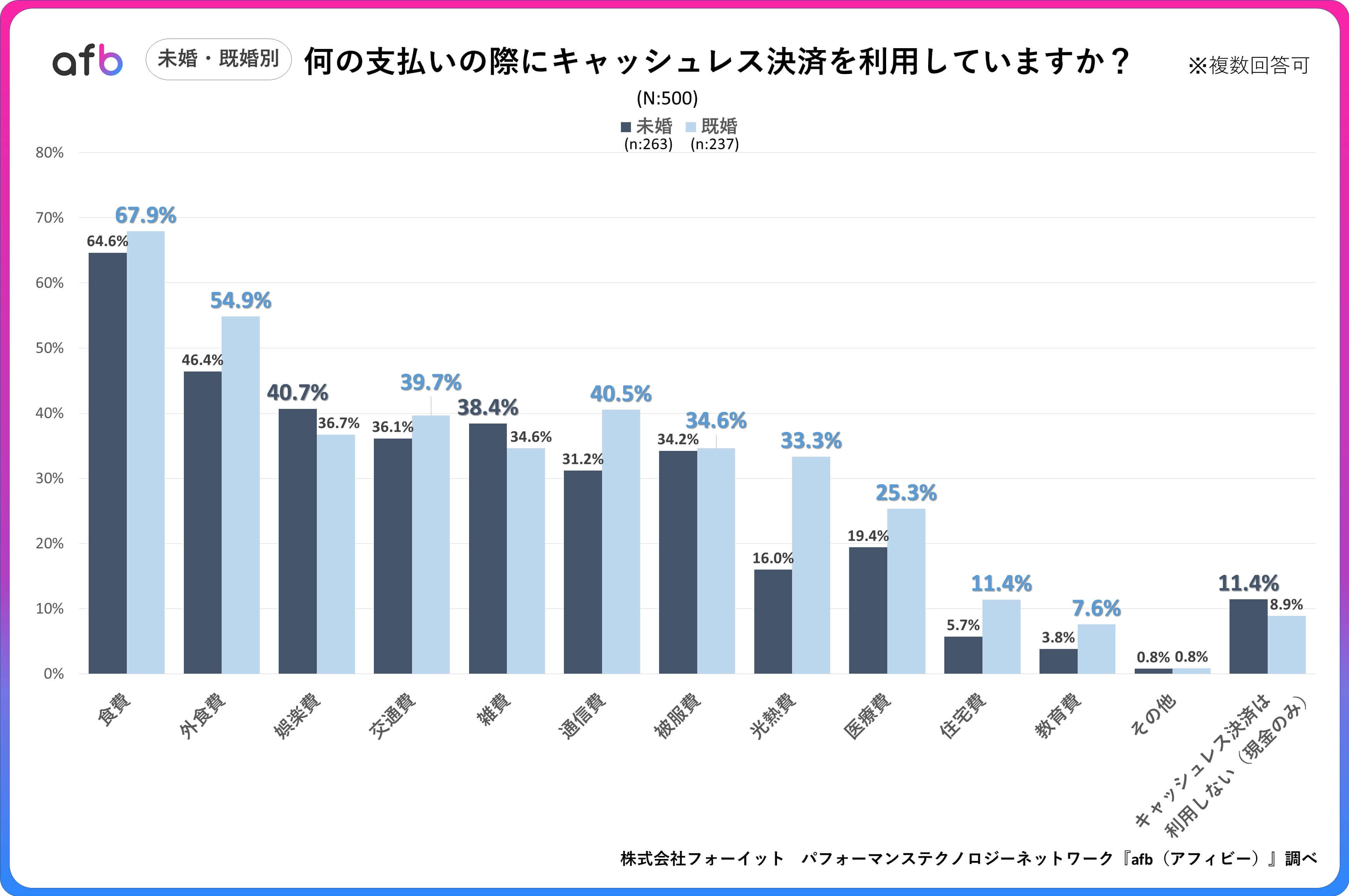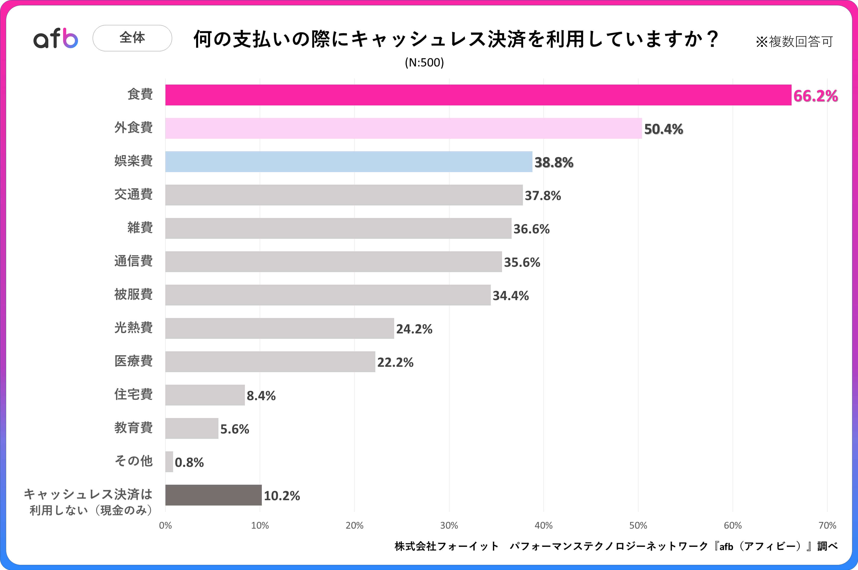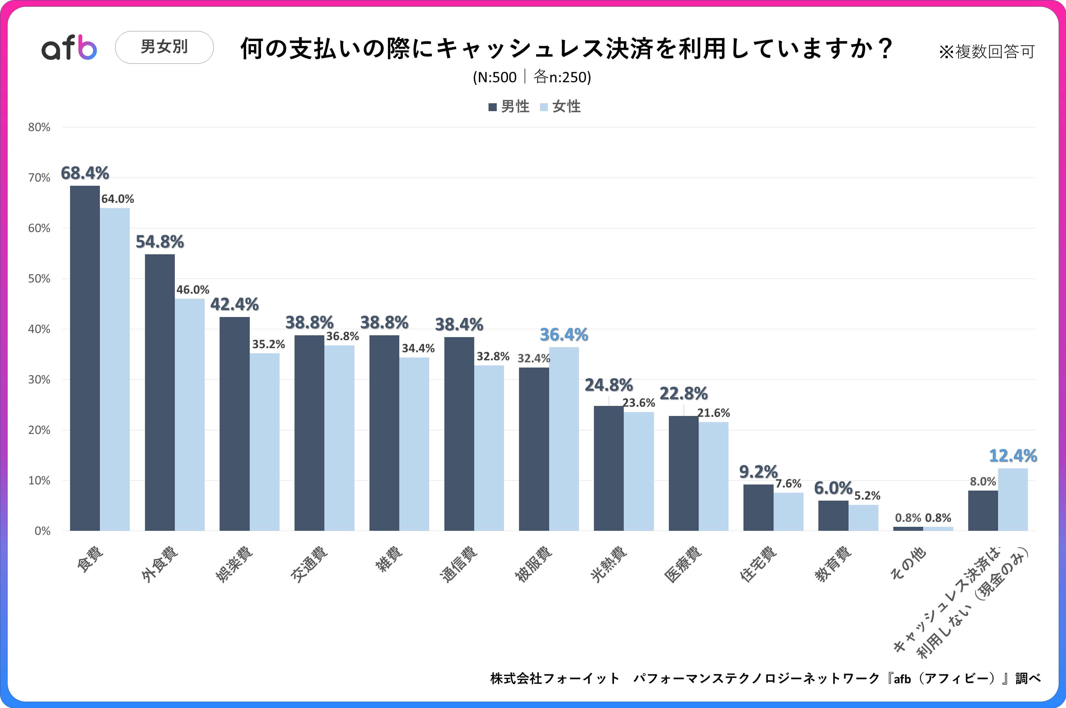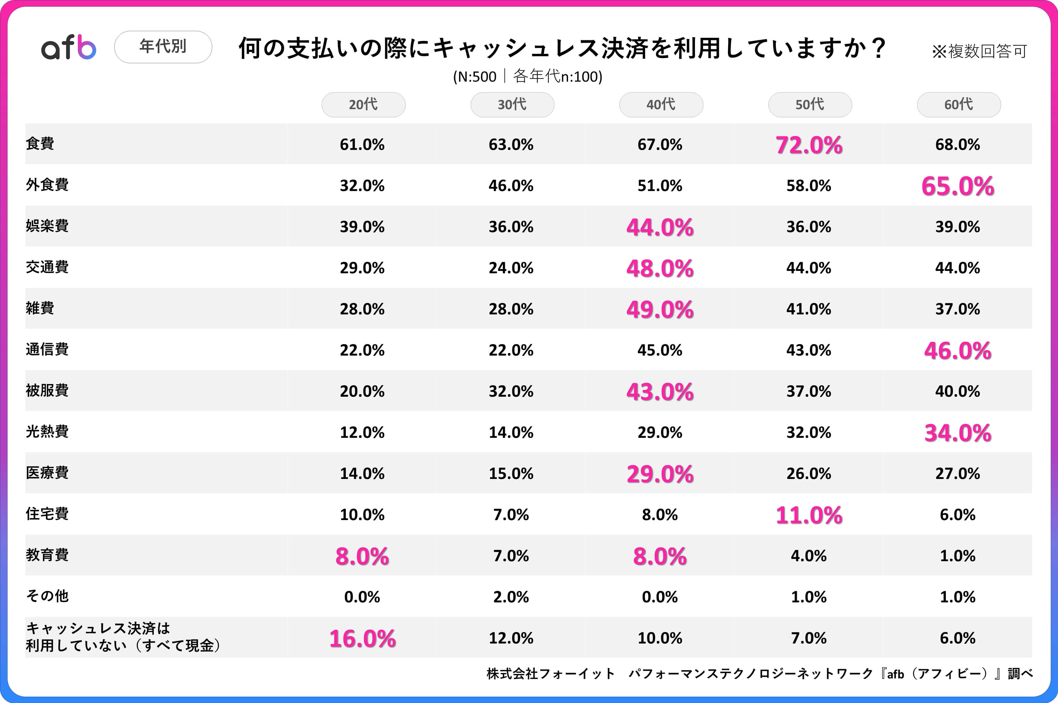 パフォーマンステクノロジーネットワーク「afb(アフィビー)」の開発運用をおこなう株式会社フォーイットは、全国の20代~60代までの男女500人を対象にキャッシュレス決済に関するアンケートを実施し、年代別等の特徴についてまとめました。