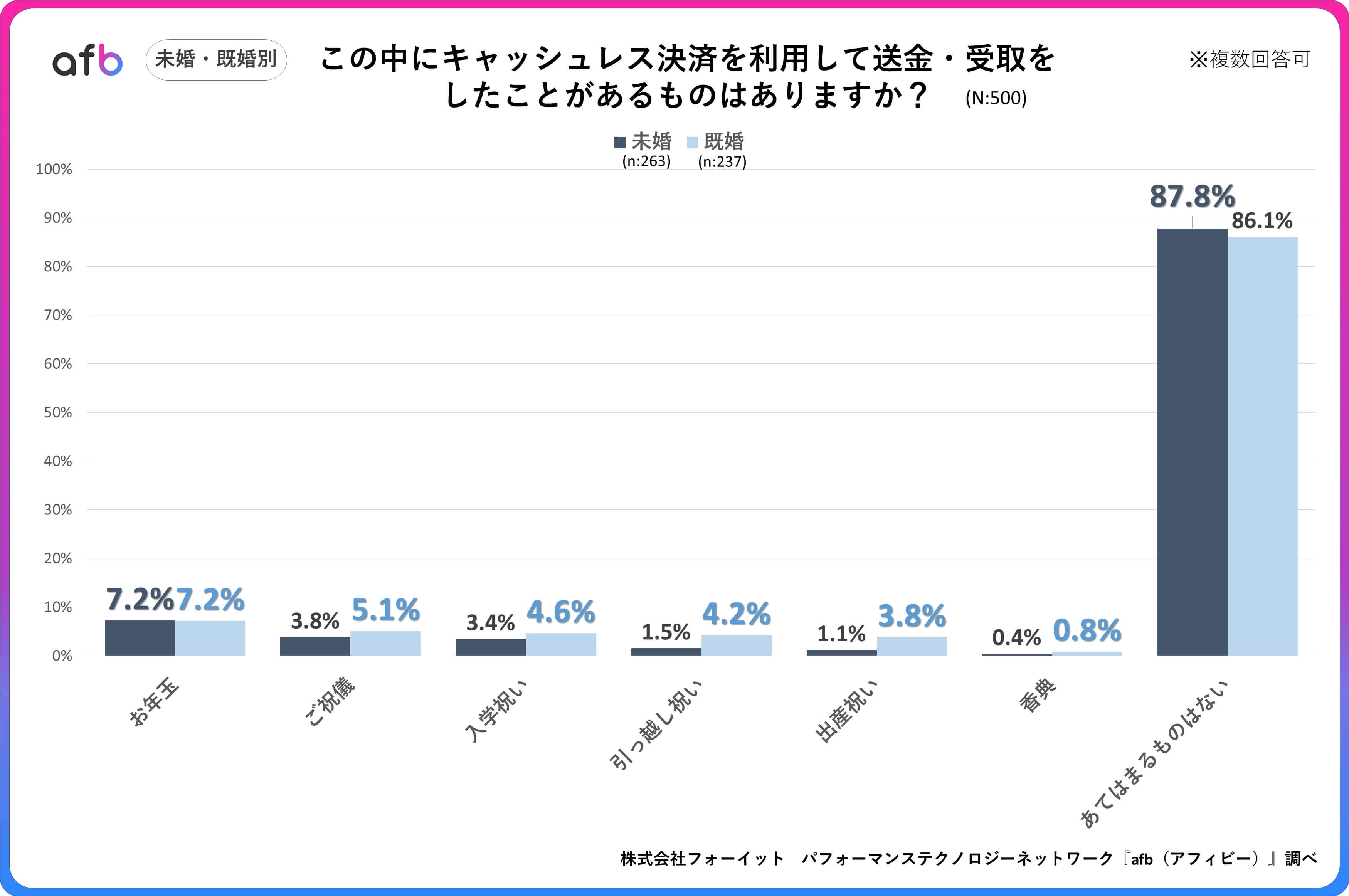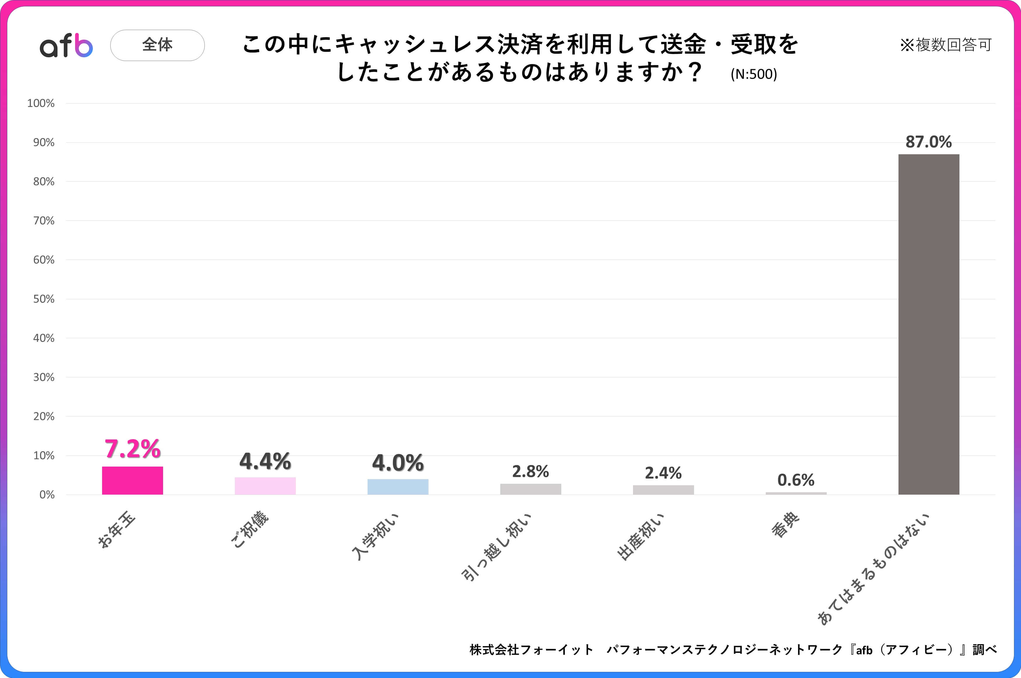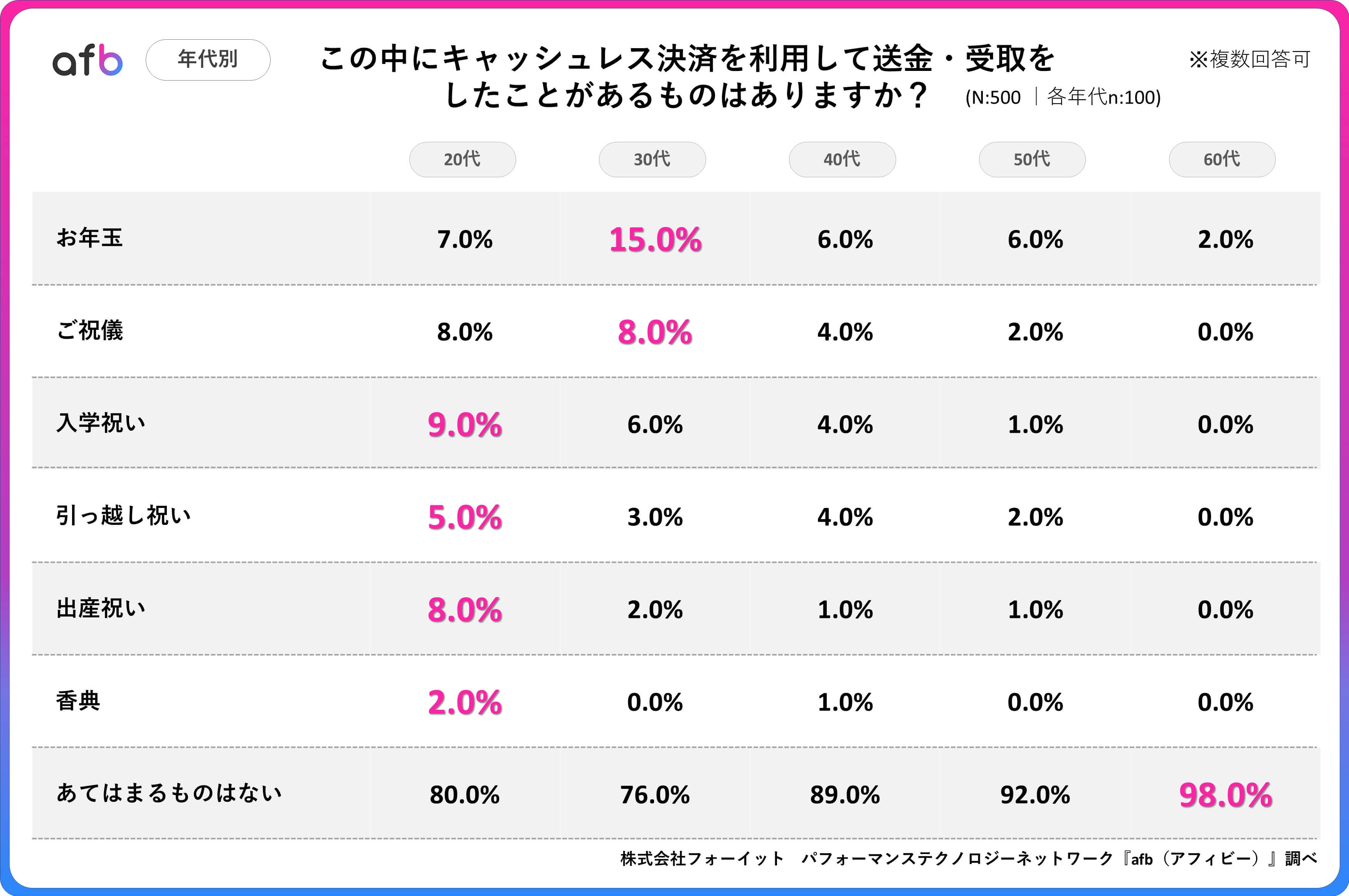 パフォーマンステクノロジーネットワーク「afb(アフィビー)」の開発運用をおこなう株式会社フォーイットは、全国の20代~60代までの男女500人を対象にキャッシュレス決済に関するアンケートを実施し、年代別等の特徴についてまとめました。