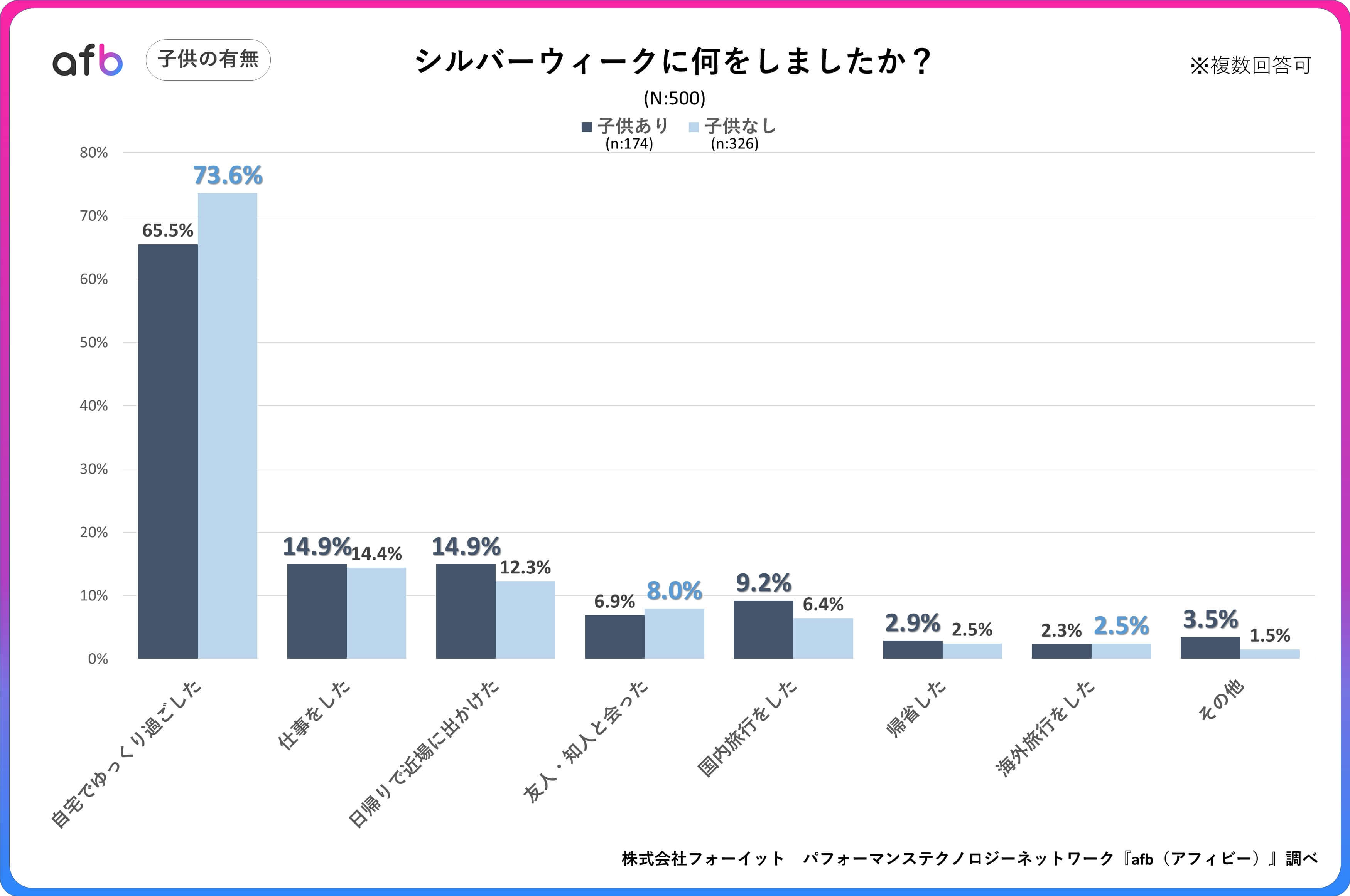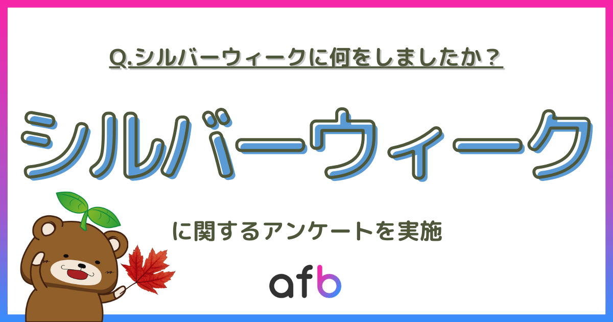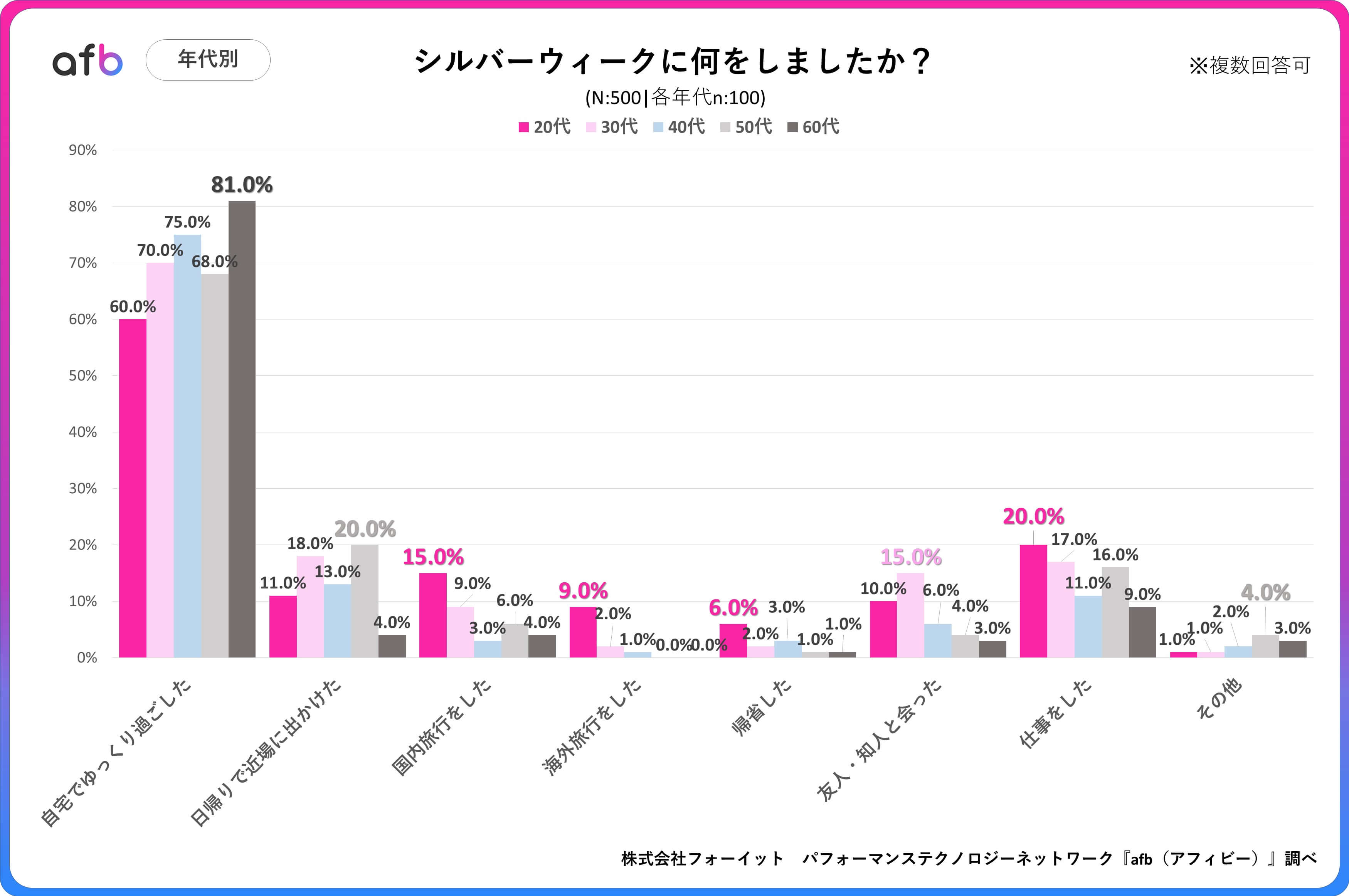 パフォーマンスマーケティングプラットフォーム「afb(アフィビー)」の開発運用をおこなう株式会社フォーイットは、全国の20歳~60歳までの男女500人を対象にシルバーウィークに関するアンケートを実施し、年代別等の特徴についてまとめました。