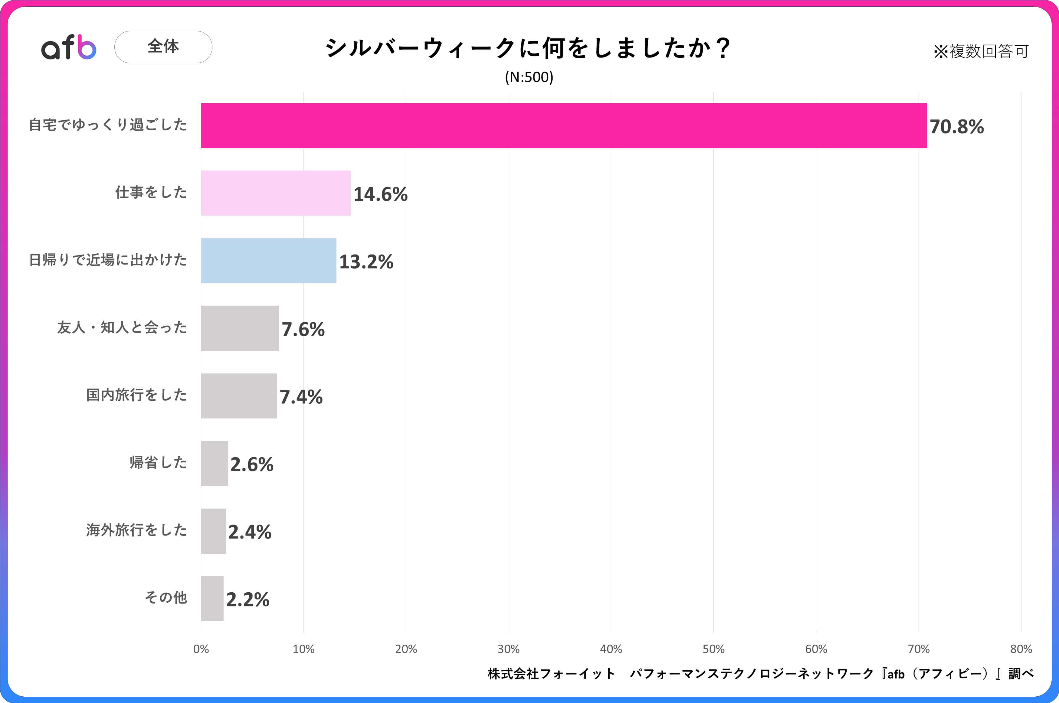 全国の20代〜60代の男女を対象に、「シルバーウィークに何をしましたか?」というアンケートを実施したところ、最も多かった回答は「自宅でゆっくり過ごした」で70.8%でした。次いで、「仕事をした」が14.6%、「日帰りで近場に出かけた」が13.2%で続くという結果になりました。また、「その他」として「キャンプをした」や「子供の行事に参加した」などの回答が得られました。