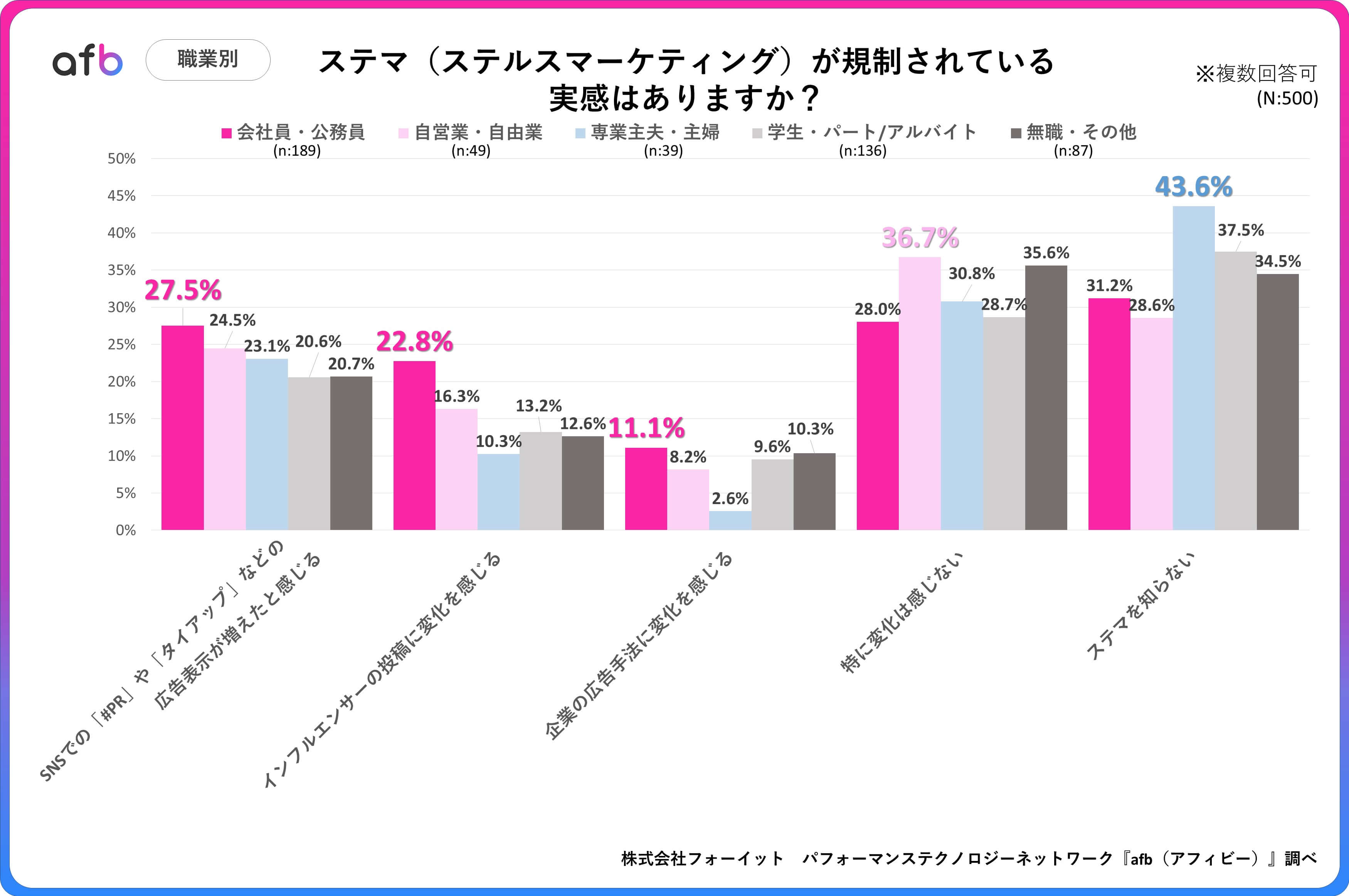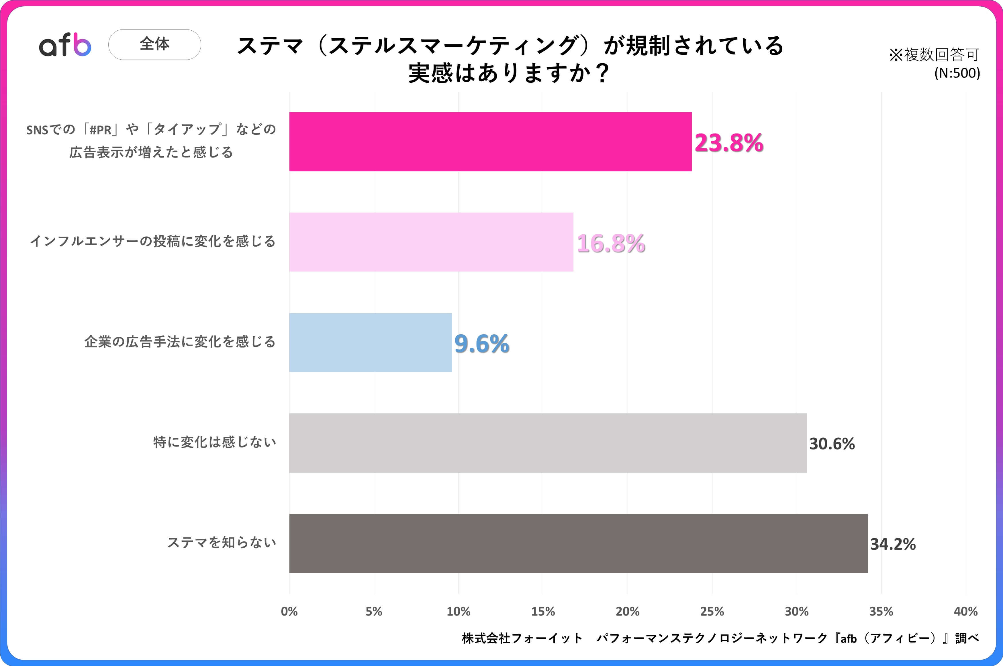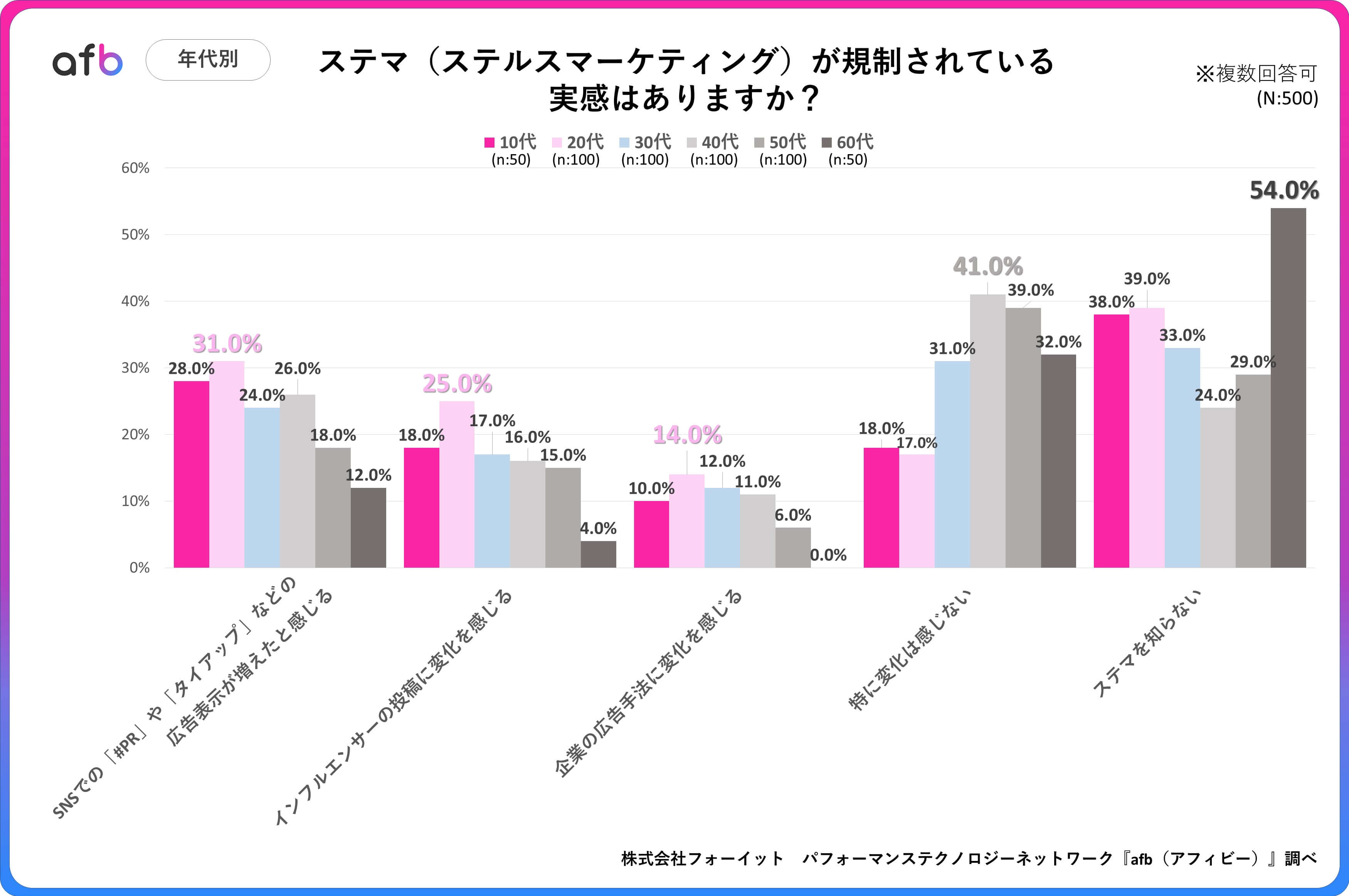 アフィリエイトプラットフォーム「afb(アフィビー)」の開発運用をおこなう株式会社フォーイットは、全国の10代~60代までの男女500人を対象にステマ規制に関するアンケートを実施し、年代別等の特徴についてまとめました。