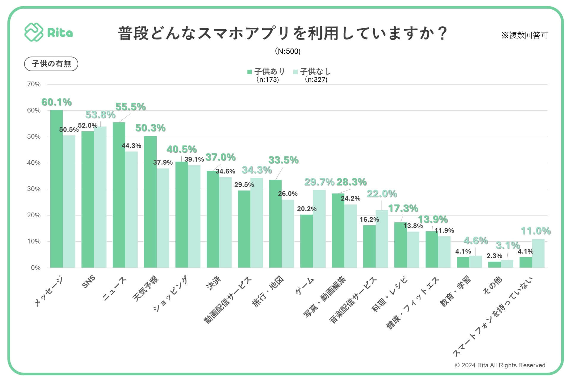 子供の有無で見ると、最も差が大きかった項目は「天気予報」で子供がいる方の回答が約14%高くなりました。特に、子供がまだ小さい場合は気温に合った服を選んだり、雨が降る場合は傘を持たせたりなど、親が気をつけなければならないことが多いため、天気予報アプリを日常的に利用している方が多いのかもしれません。また「ニュース」でも子供がいる方の回答が10%以上高くなっており、近隣で事件が起きたり、公共交通機関が止まっていたりする場合など、すぐに情報を得られて子供に伝えられるニュースアプリの利用率が高くなっていると考えられます。