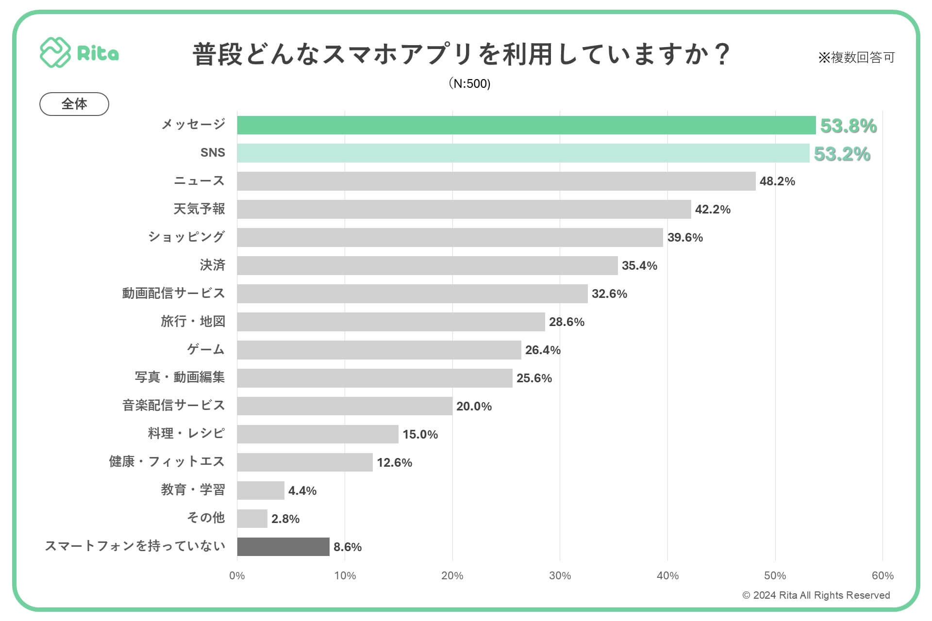 20代〜60代の男女を対象に、「普段どんなスマホアプリを利用していますか?」というアンケートを実施したところ、最も多かった回答は「メッセージ」で53.8%でした。次いで、「SNS」が53.2%、「ニュース」が48.2%で続くという結果になりました。
