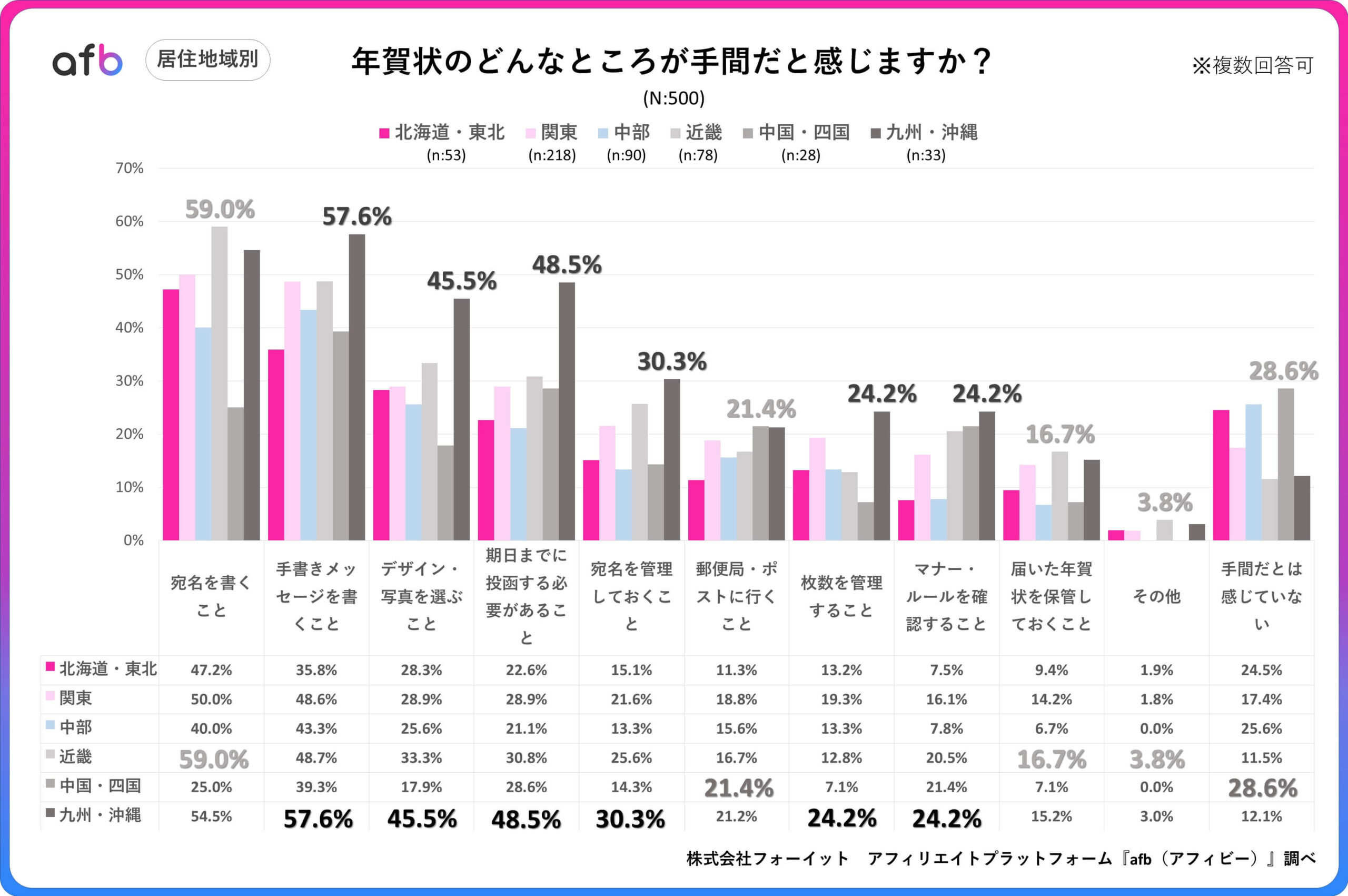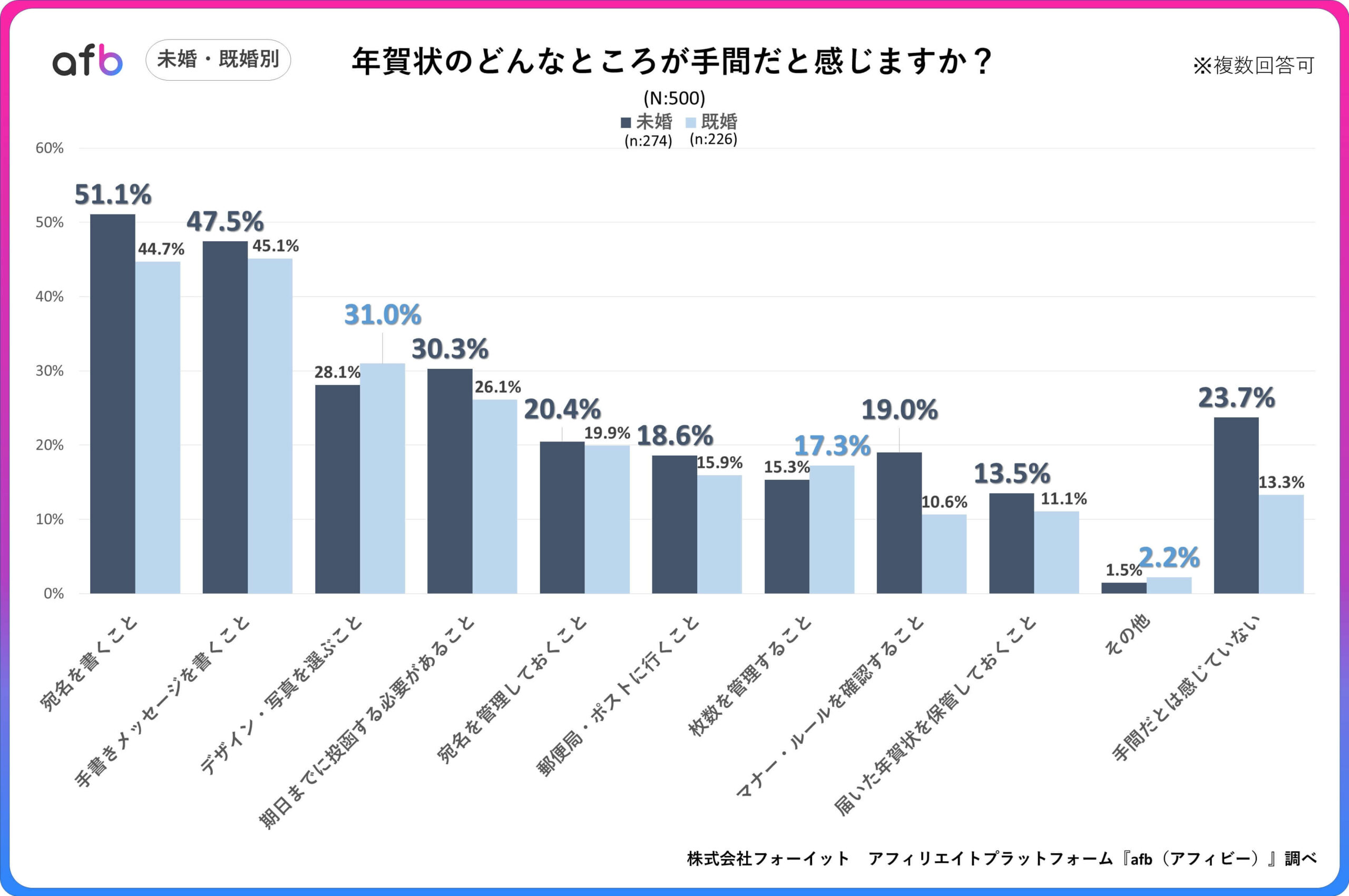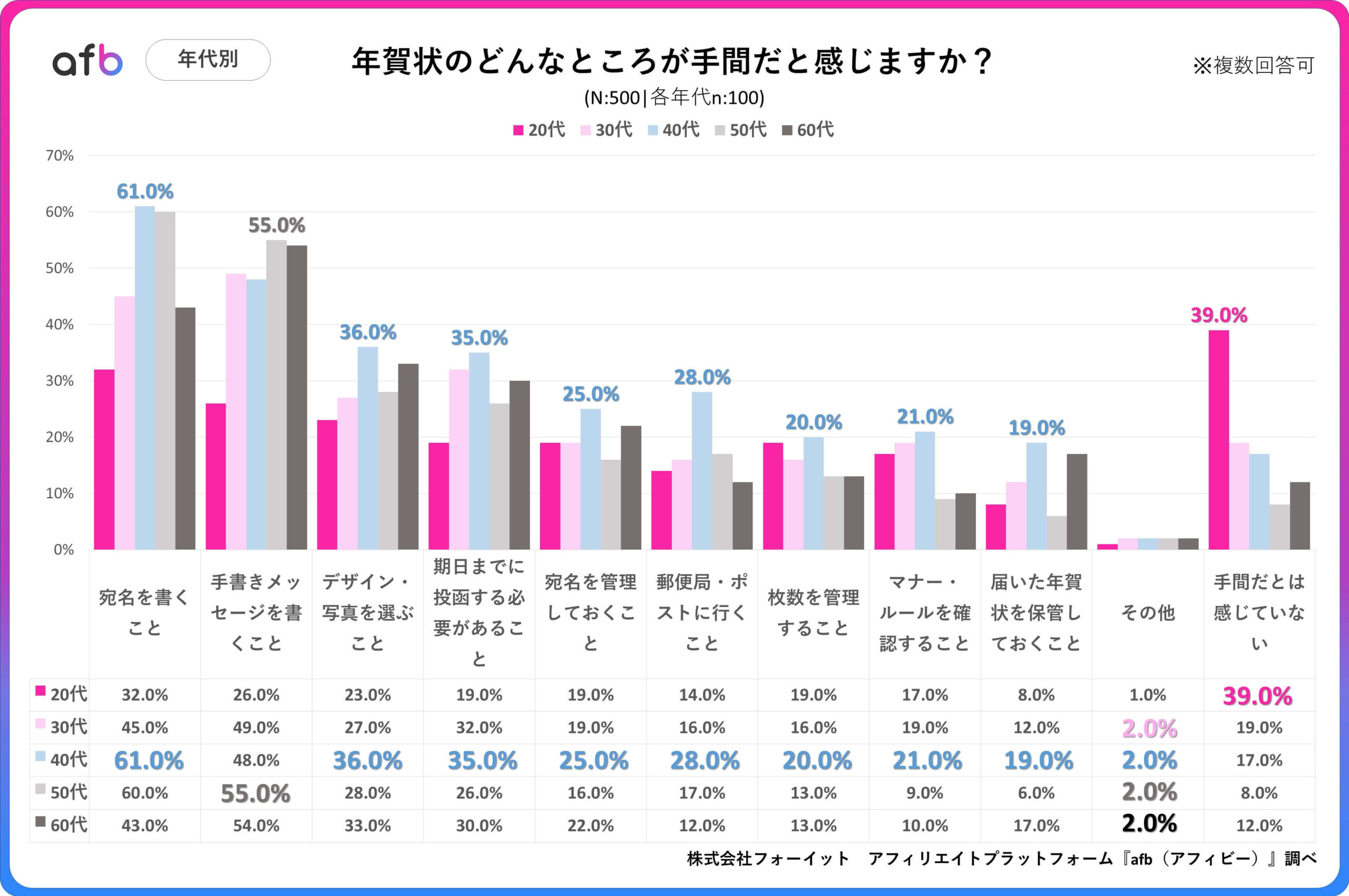 アフィリエイトプラットフォーム「afb(アフィビー)」の開発運用をおこなう株式会社フォーイットは、全国の20代~60代までの男女500人を対象に年賀状に関するアンケートを実施し、年代別等の特徴についてまとめました。