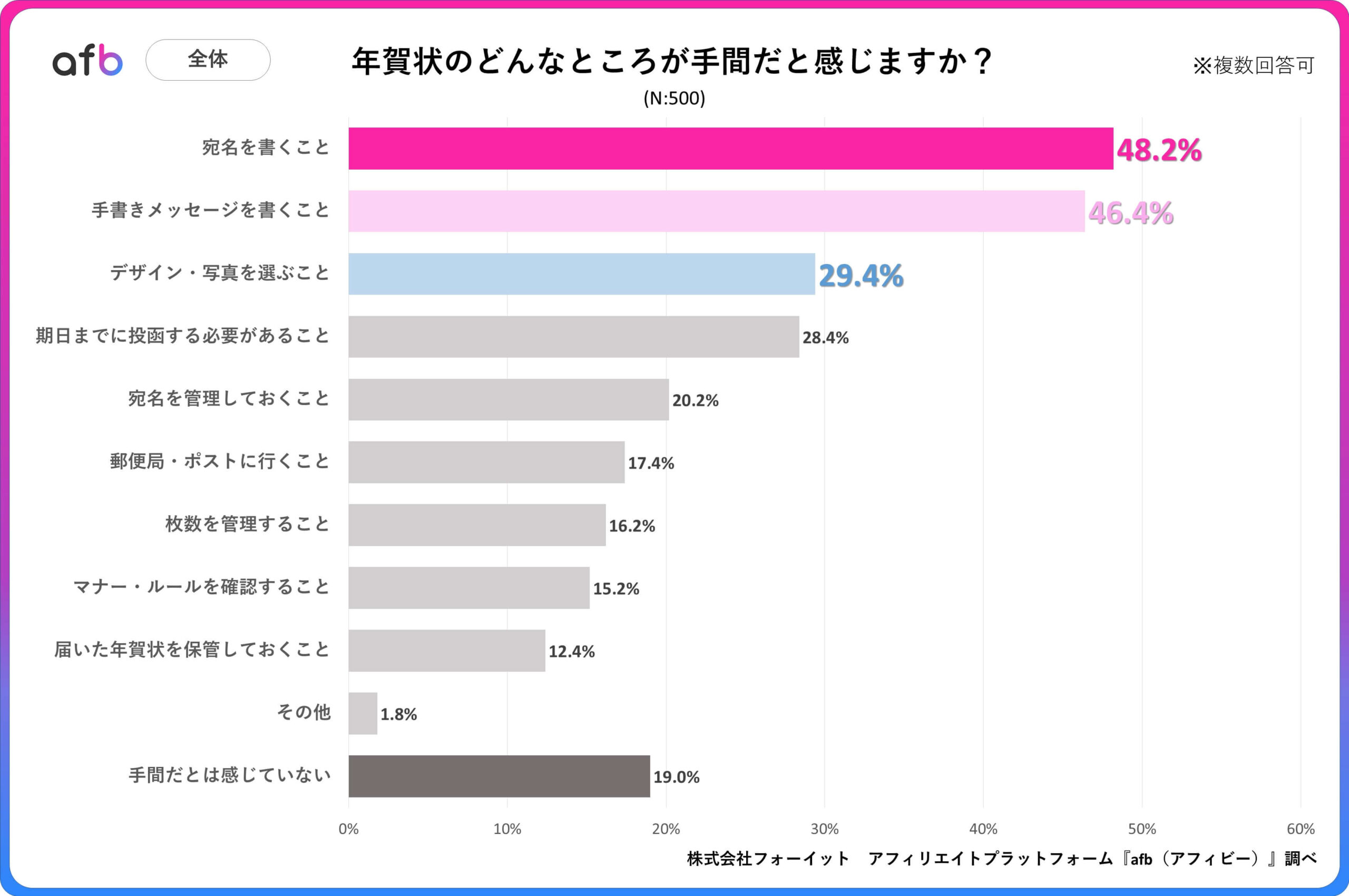 全国の20代〜60代の男女を対象に、「年賀状のどんなところが手間だと感じますか?」というアンケートを実施したところ、最も多かった回答は「宛名を書くこと」で48.2%でした。次いで、「手書きメッセージを書くこと」が46.4%、「デザイン・写真を選ぶこと」が29.4%で続くという結果になりました。また、「手間だとは感じていない」と回答した方は19.0%でした。