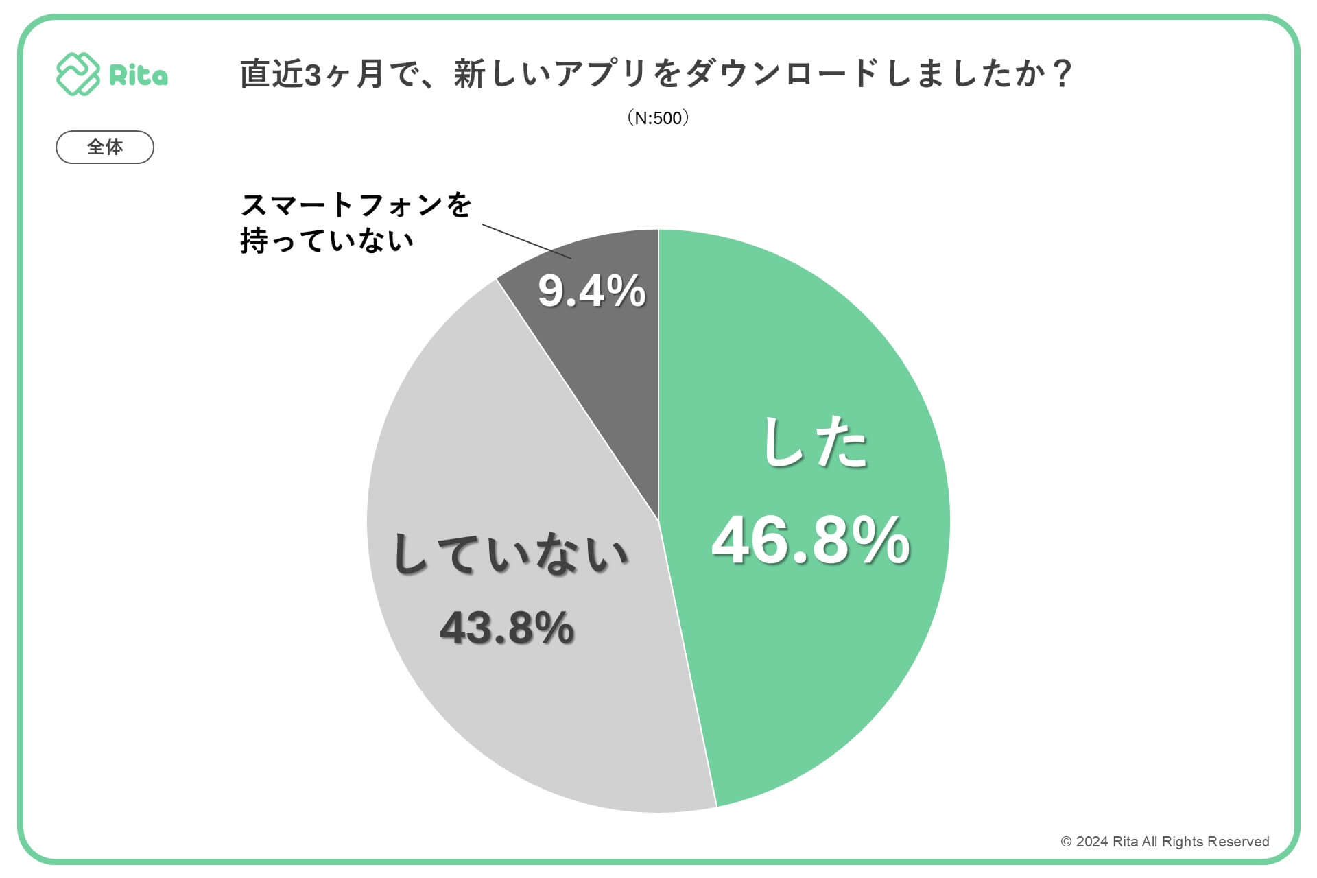 全国の20代〜60代の男女を対象に、「直近3ヶ月で新しいアプリをいくつダウンロードしましたか?」というアンケートを実施したところ、「した」と回答した方は46.8%でした。